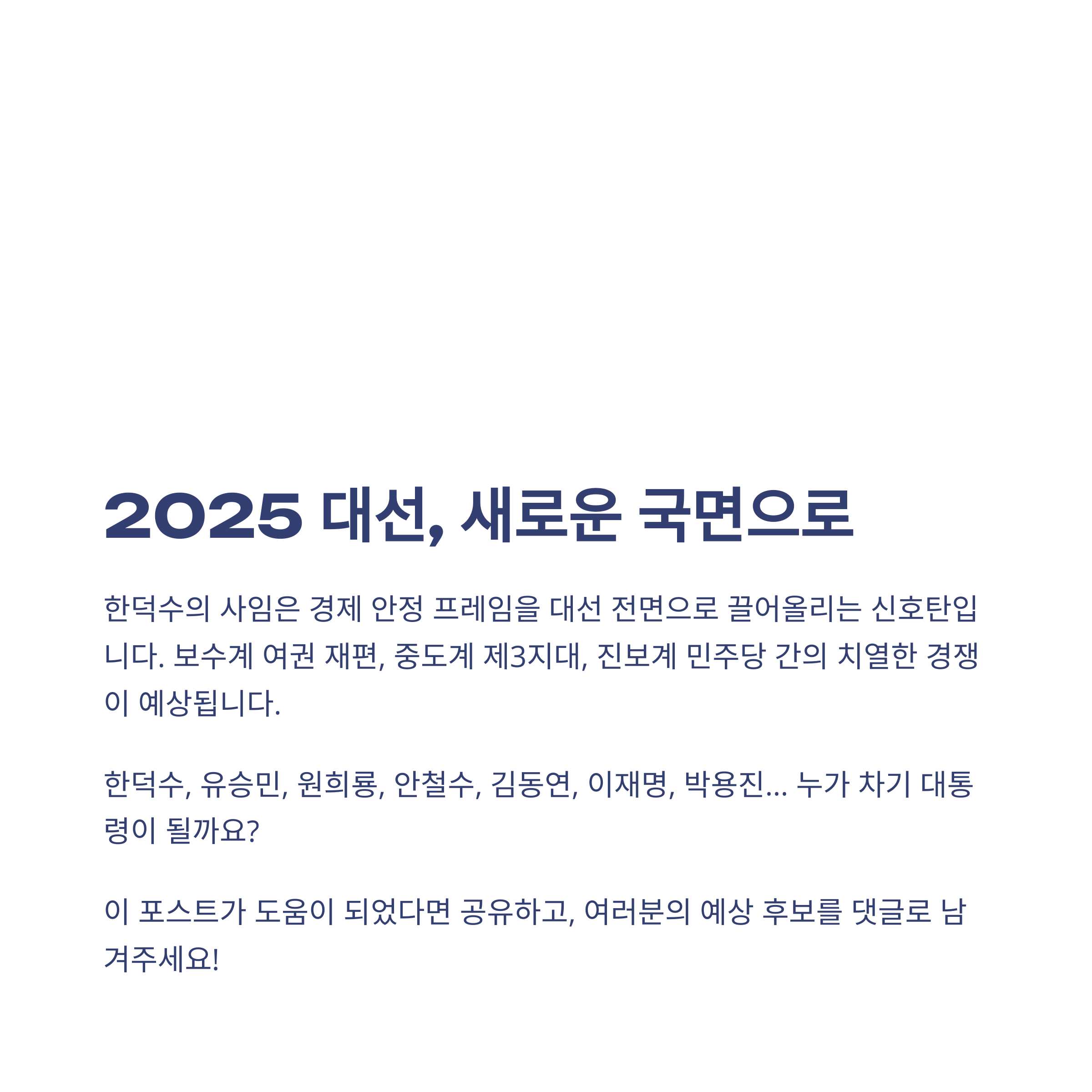 안녕하세요. 오늘은 대한민국 정치 지형을 뒤흔들 수 있는 중대 발표가 있었습니다. 바로 한덕수 국무총리가 사퇴를 선언하며 사실상 2025년 대선 출마를 공식화했다는 소식인데요. 평소 "정치인이 아니라 행정가"라고 했던 그의 선택은 단순한 은퇴가 아닌, 책임의 확장으로 보입니다. 제가 직접 담화를 지켜본 바로는 단순한 권력 의지가 아니라, 국정을 총괄해본 관료의 고민이 담긴 깊은 메시지가 느껴졌어요. 이 글에서는 그의 사임 배경부터 정치적 메시지, 대선 구도에 미치는 파장까지 정리해드릴게요.