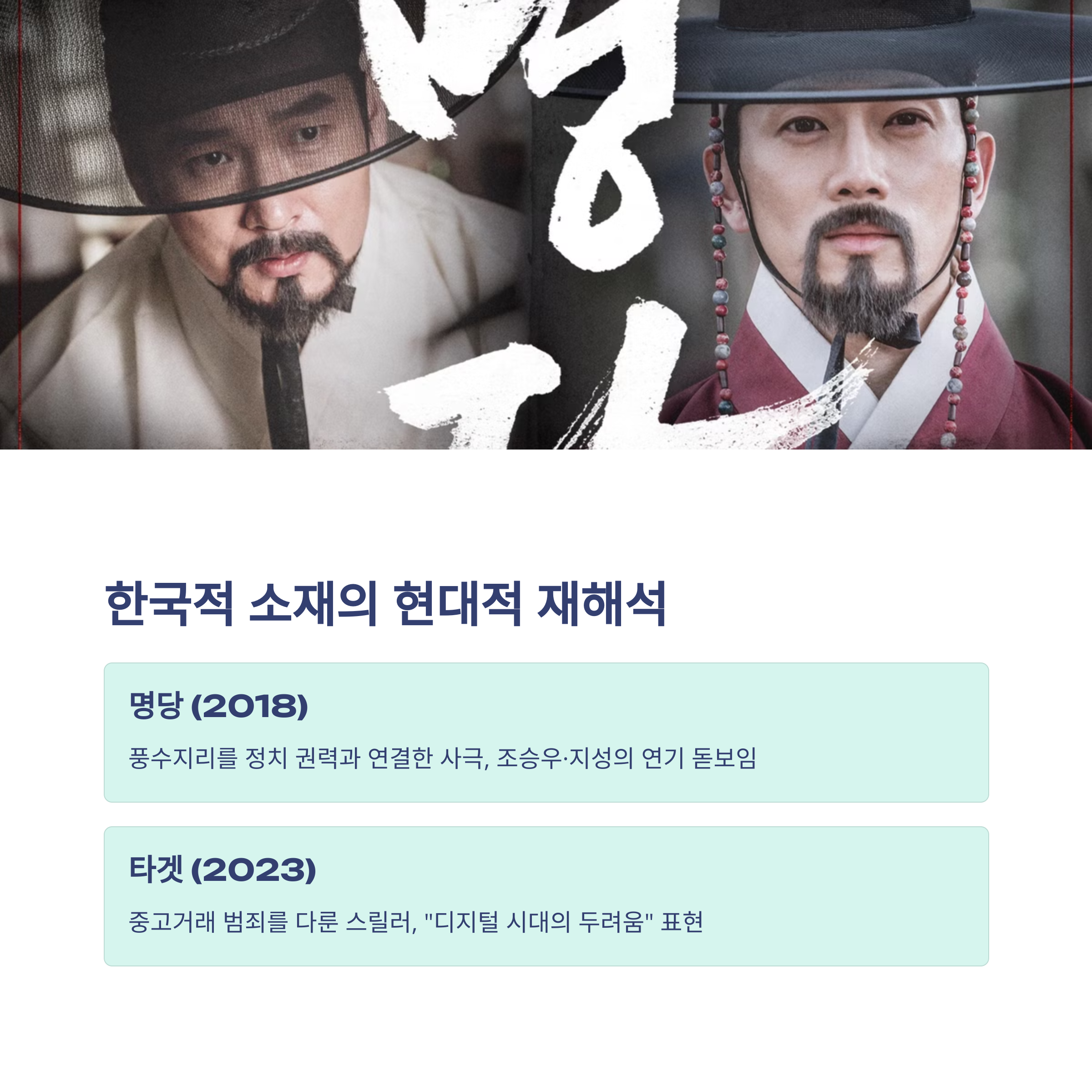 - ‘명당’ (2018) – 풍수지리를 정권 쟁탈과 연결한 사극. 조승우, 지성 주연으로 스케일과 깊이를 모두 갖춘 정치 드라마.