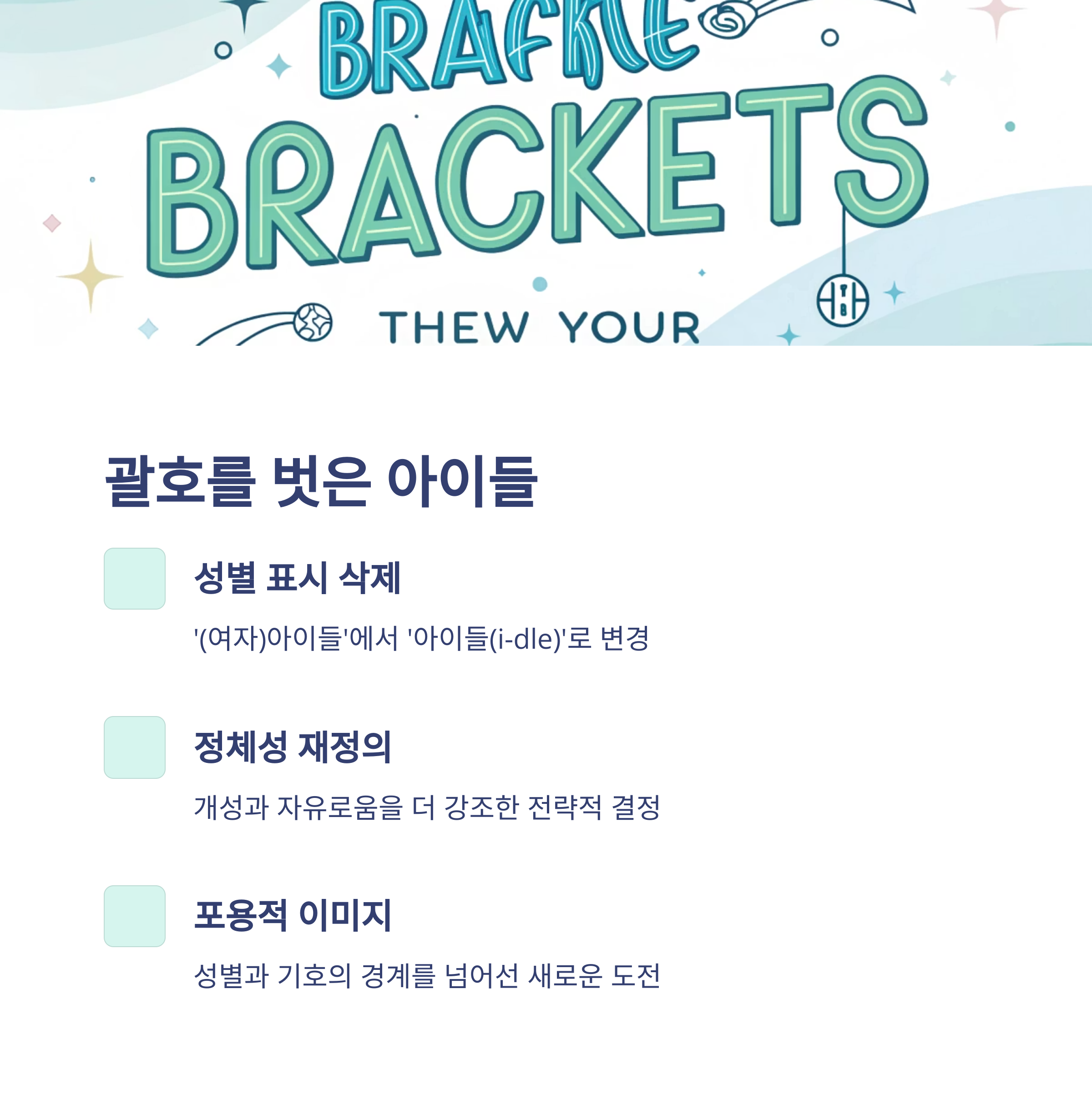 2025년 5월 1일, ‘(여자)아이들’이라는 이름으로 데뷔한 지 딱 7년을 하루 앞둔 시점에서, 그들은 전격적으로 그룹명을 ‘아이들(i-dle)’로 바꿨습니다. 괄호와 ‘여자’라는 성별 표시를 모두 삭제한 이 결정은 단순한 이름 변경이 아니라 정체성에 대한 재정의였습니다. 사실, ‘아이들’이라는 이름 자체가 처음부터 ‘개성과 자유로움’을 상징했지만, 시간이 지나면서 ‘여자’라는 접두사는 오히려 그들의 음악적 세계관을 제한한다는 평가도 있었죠. 이 변화를 통해 ‘성별과 기호의 경계를 넘어서는 포용적 이미지’를 내세운 겁니다.