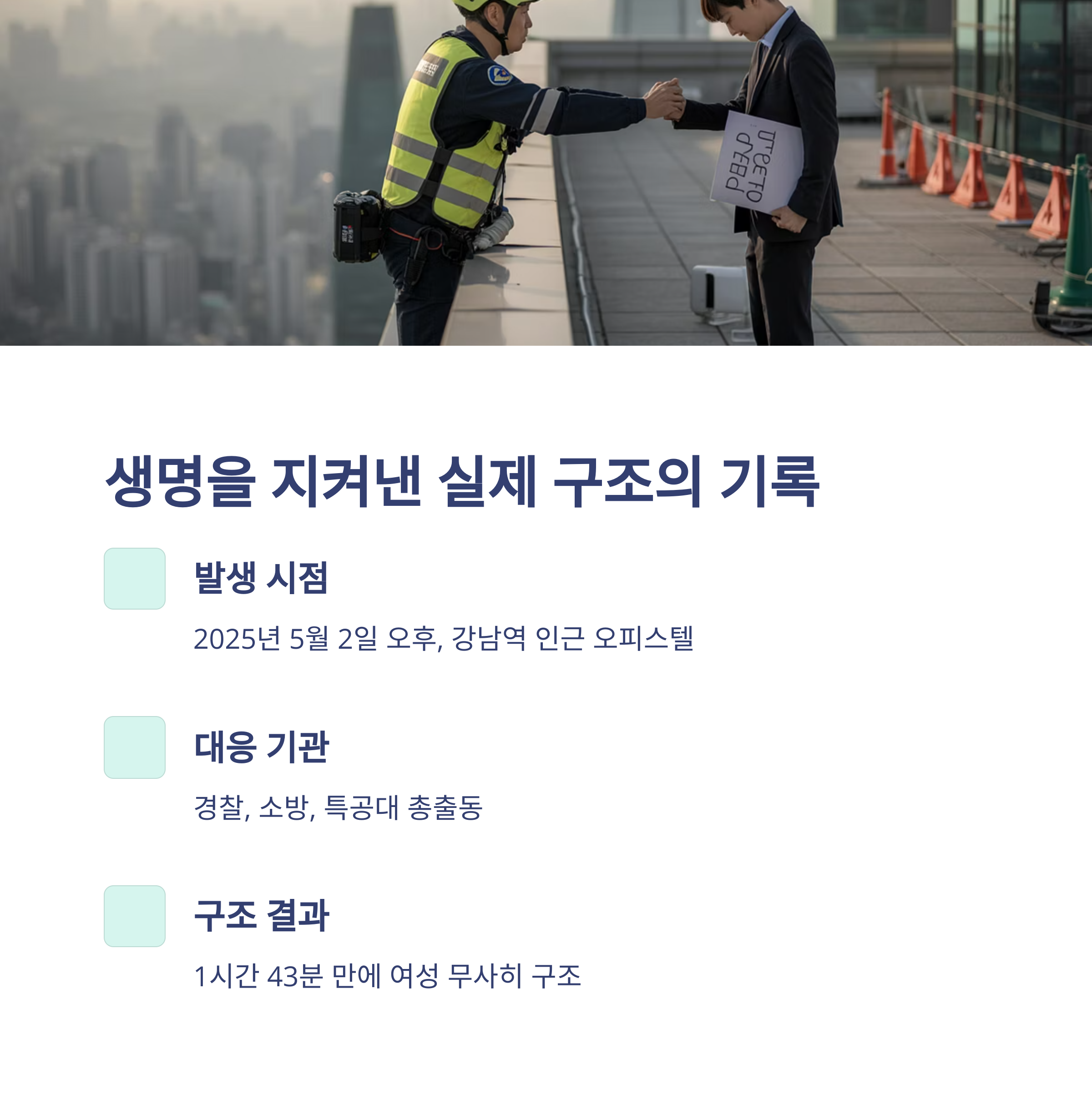 2025년 5월 2일 오후, 서울 강남역 인근에서 충격적인 사건이 발생했습니다. 한 여성이 오피스텔 19층 옥상 난간 위에 서 있다는 신고가 접수되며, 경찰과 소방, 특공대까지 총출동하는 긴박한 구조 작전이 전개되었죠. 평일 한낮, 시민들로 북적이던 강남 중심가에서 벌어진 이 사건은 단지 '소동'이 아니라, 생명을 지켜낸 실제 구조의 기록이었습니다. 저 역시 현장을 지나던 시민으로서 SNS를 통해 처음 이 상황을 접했을 때, 등골이 오싹할 정도로 긴장됐던 기억이 생생합니다. 다행히도, 1시간 43분간의 설득과 대응 끝에 여성을 무사히 구조해냈습니다. 오늘은 이 사건의 전개 과정과 구조 작전의 디테일을 데이터와 함께 정리해보겠습니다.