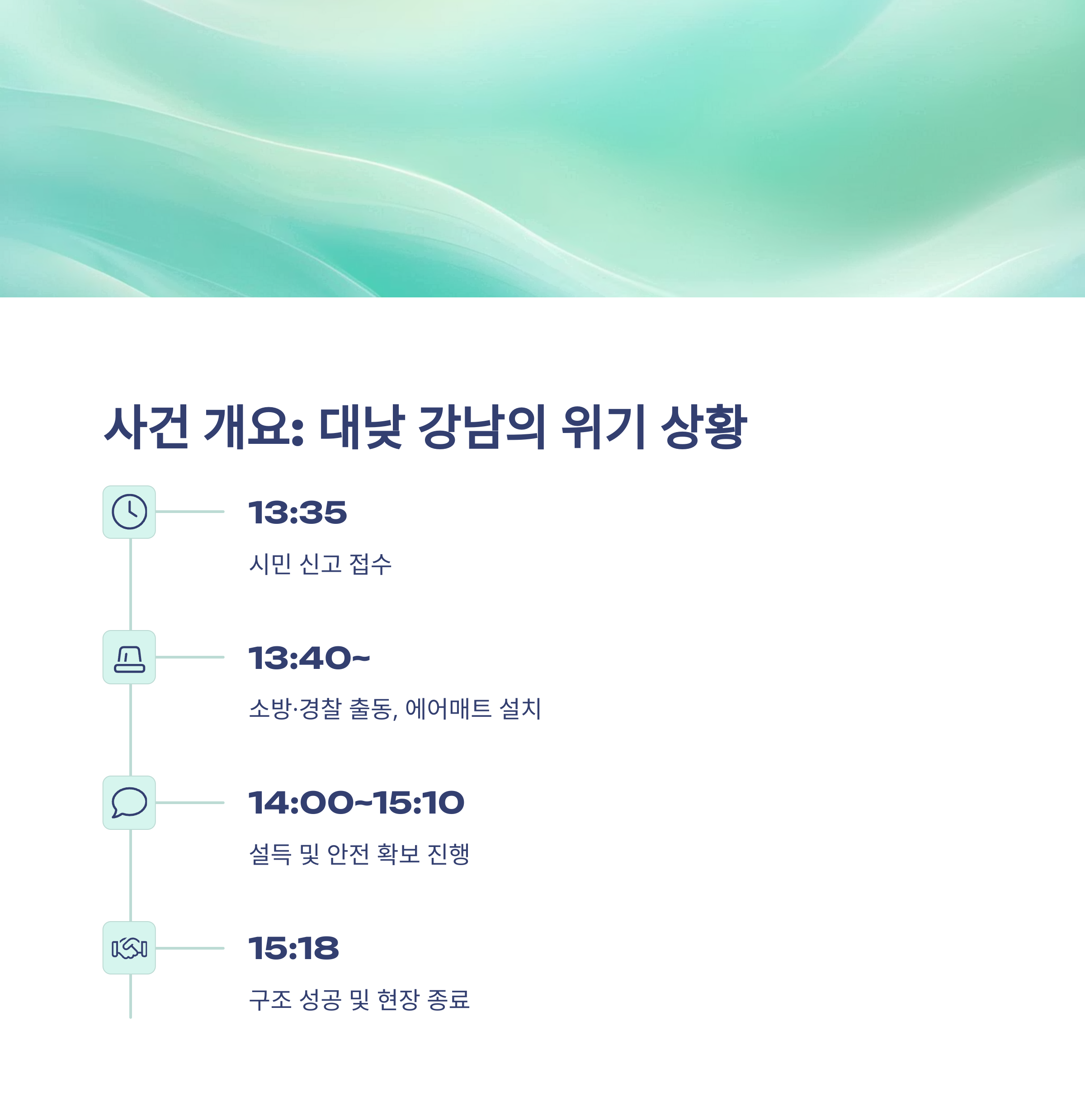 이번 강남 도심 투신 시도 사건은 단순한 뉴스 한 줄로 끝날 일이 아니었습니다. 생명을 살려낸 구조 작전이었고, 위기 상황에서의 대응 역량과 시스템의 중요성을 보여준 실제 사례였습니다. 특히 심리적 설득의 전문성, 에어매트 등 장비 운용, 기관 간 협업이 맞물려 신속하고 정확한 대처가 이뤄졌죠.