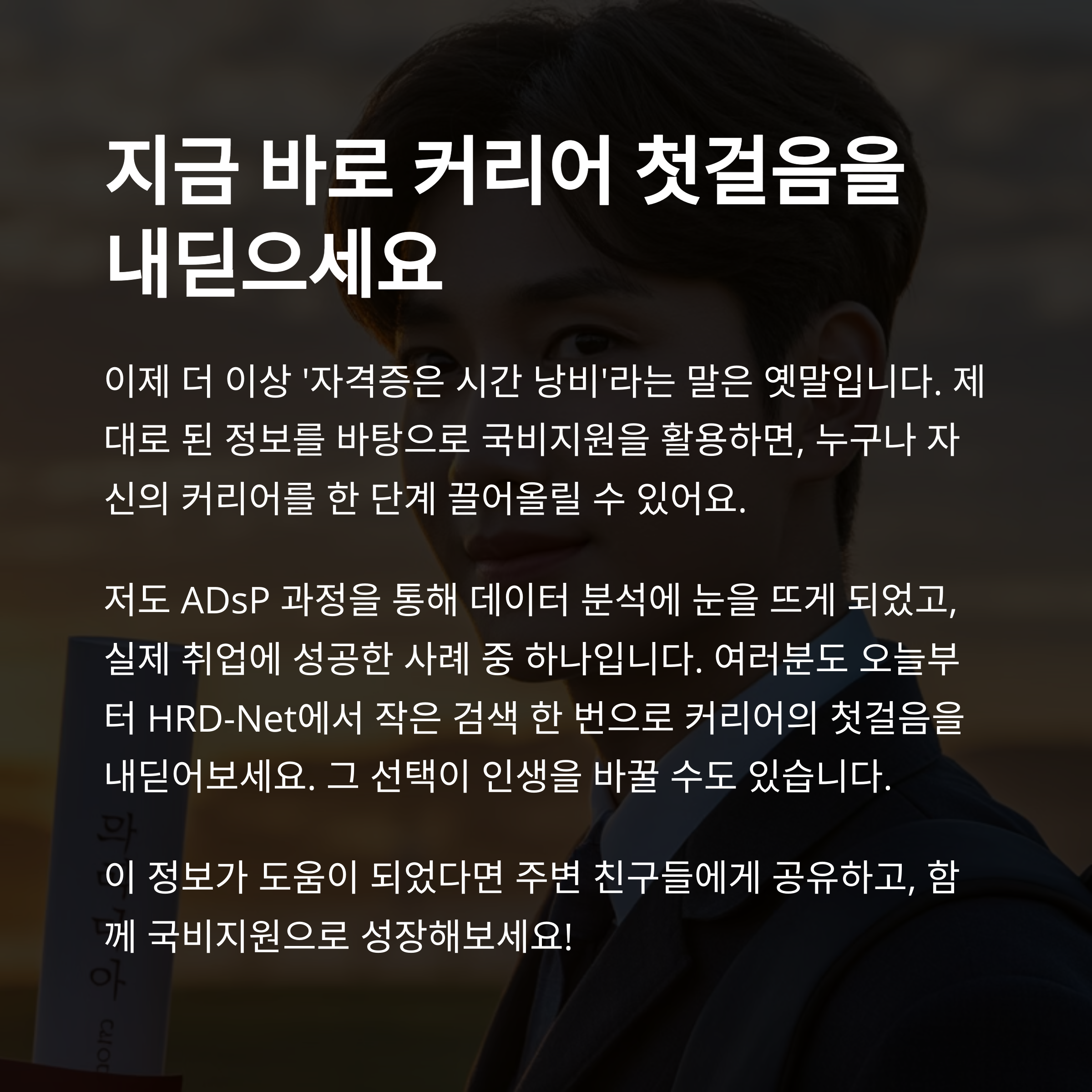 이제 더 이상 ‘자격증은 시간 낭비’라는 말은 옛말입니다. 제대로 된 정보를 바탕으로 국비지원을 활용하면, 누구나 자신의 커리어를 한 단계 끌어올릴 수 있어요. 저도 ADsP 과정을 통해 데이터 분석에 눈을 뜨게 되었고, 실제 취업에 성공한 사례 중 하나입니다. 여러분도 오늘부터 HRD-Net에서 작은 검색 한 번으로 커리어의 첫걸음을 내딛어보세요. 그 선택이 인생을 바꿀 수도 있습니다.