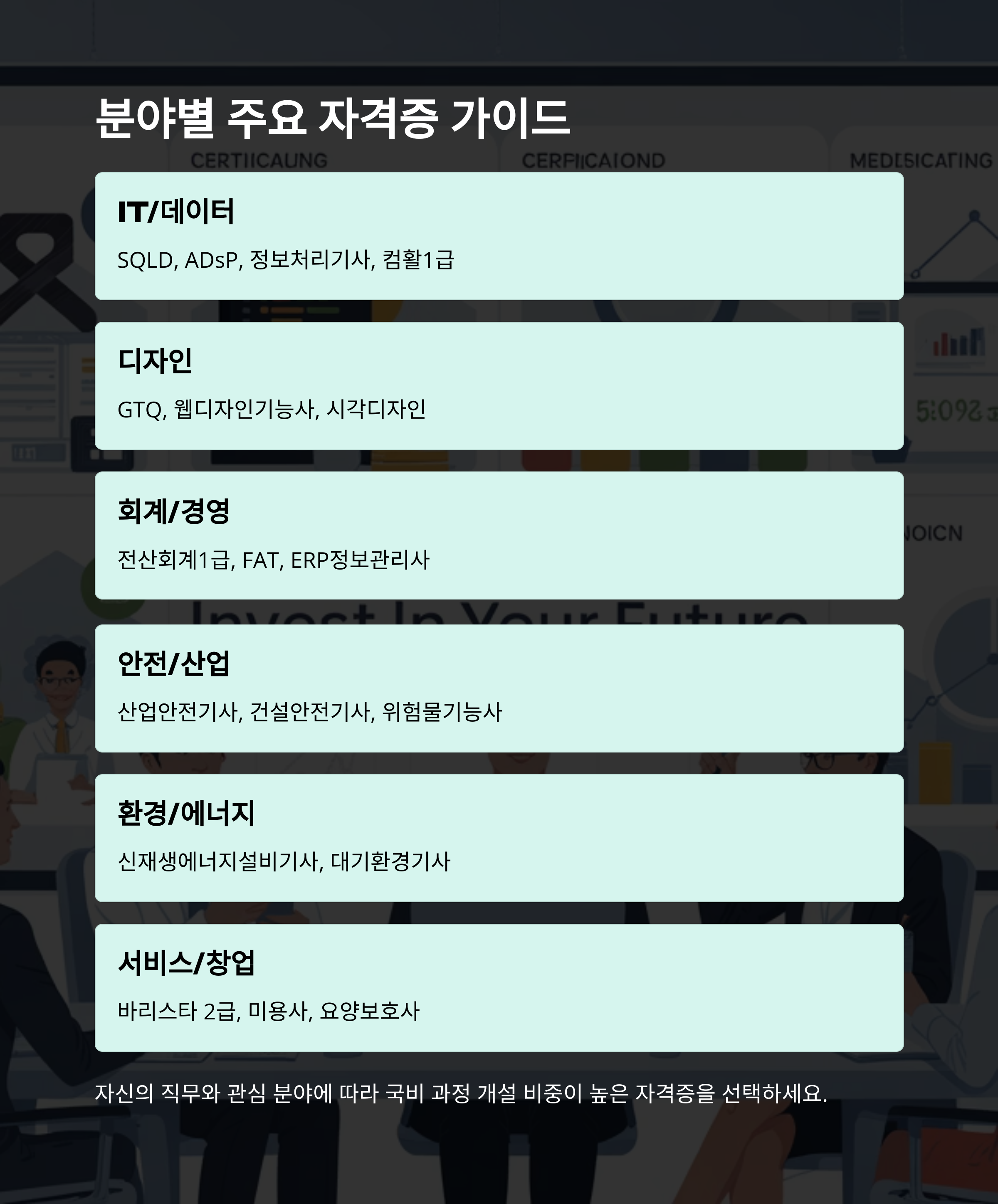 어떤 자격증을 선택해야 할지 고민된다면, 자신의 직무와 관심 분야에 따라 다음 기준을 참고해보세요. 아래 리스트는 국비 과정 개설 비중이 높은 대표 자격증을 분야별로 정리한 것입니다.