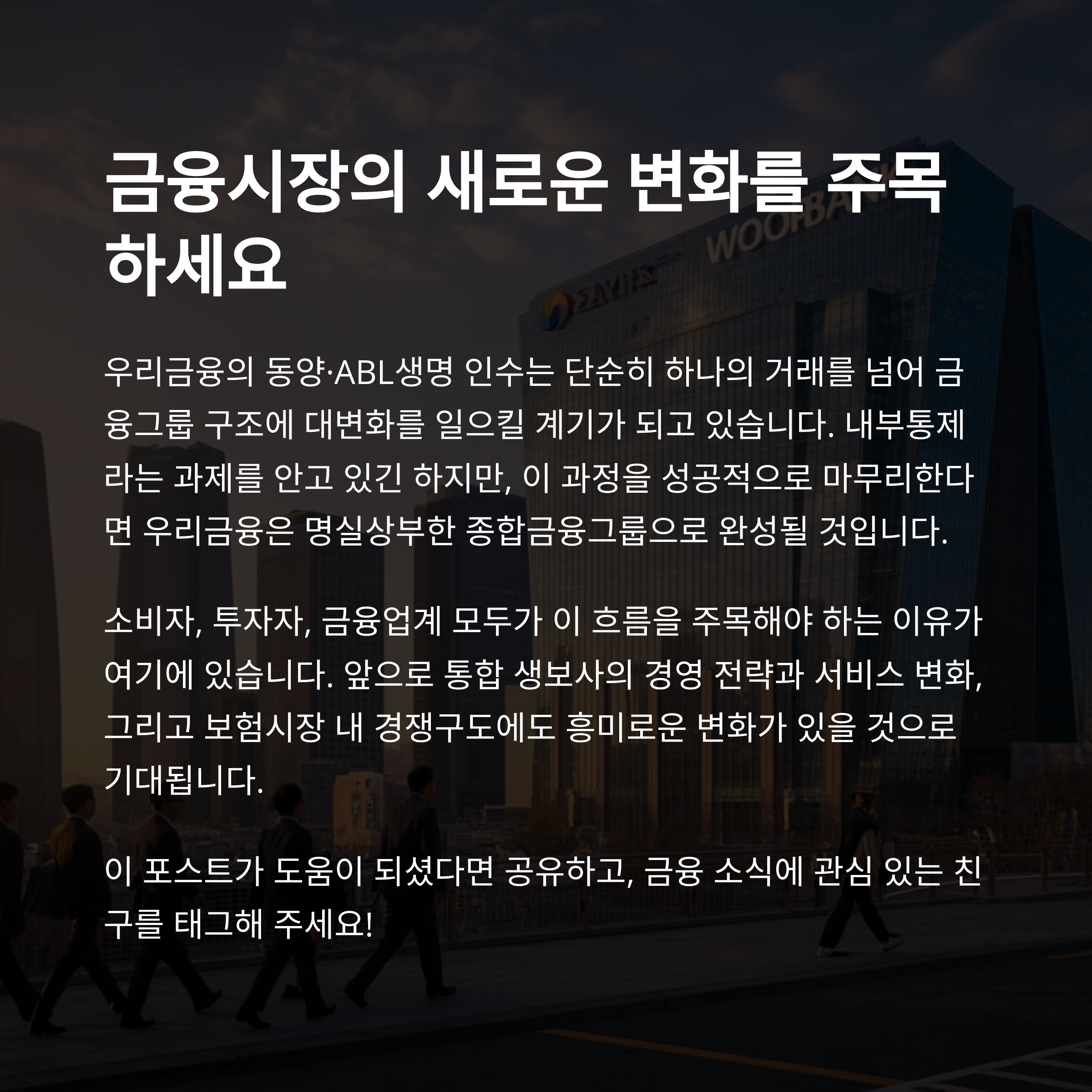 우리금융의 동양·ABL생명 인수는 단순히 하나의 거래를 넘어 금융그룹 구조에 대변화를 일으킬 계기가 되고 있습니다. 내부통제라는 과제를 안고 있긴 하지만, 이 과정을 성공적으로 마무리한다면 우리금융은 명실상부한 종합금융그룹으로 완성될 것입니다. 소비자, 투자자, 금융업계 모두가 이 흐름을 주목해야 하는 이유가 여기에 있습니다. 앞으로 통합 생보사의 경영 전략과 서비스 변화, 그리고 보험시장 내 경쟁구도에도 흥미로운 변화가 있을 것으로 기대됩니다.