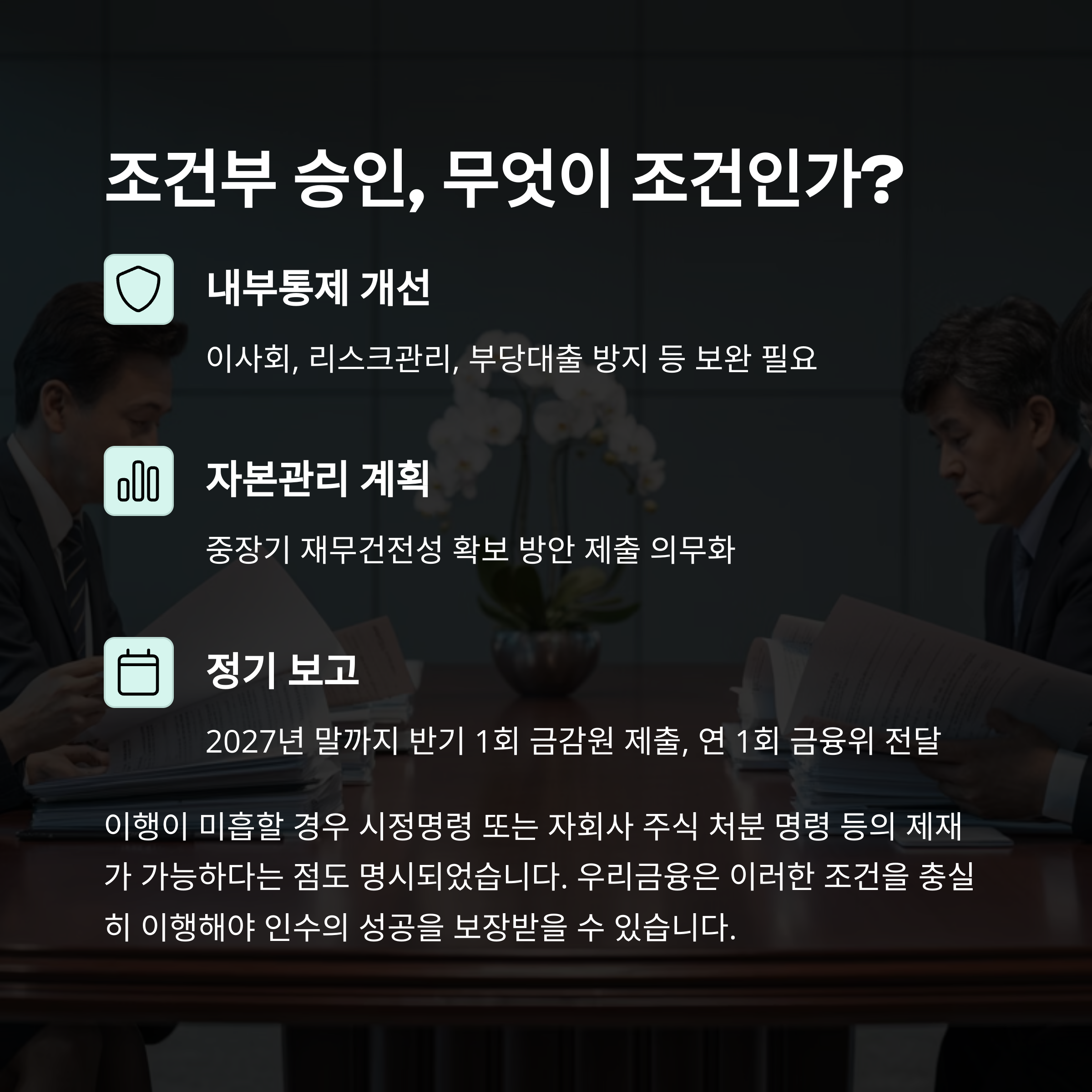 이번 인수는 무조건적인 승인이 아닌 ‘조건부 승인’ 형식으로 이루어졌습니다. 특히 내부통제 시스템의 보완과 중장기 자본관리 계획 이행이 핵심 조건으로, 우리금융은 이를 2027년 말까지 반기마다 금감원에 보고해야 합니다. 보고 내용은 연 1회 금융위로 전달되며, 이행이 미흡할 경우 시정명령 또는 자회사 주식 처분 명령 등의 제재가 가능하다는 점도 명시됐습니다.