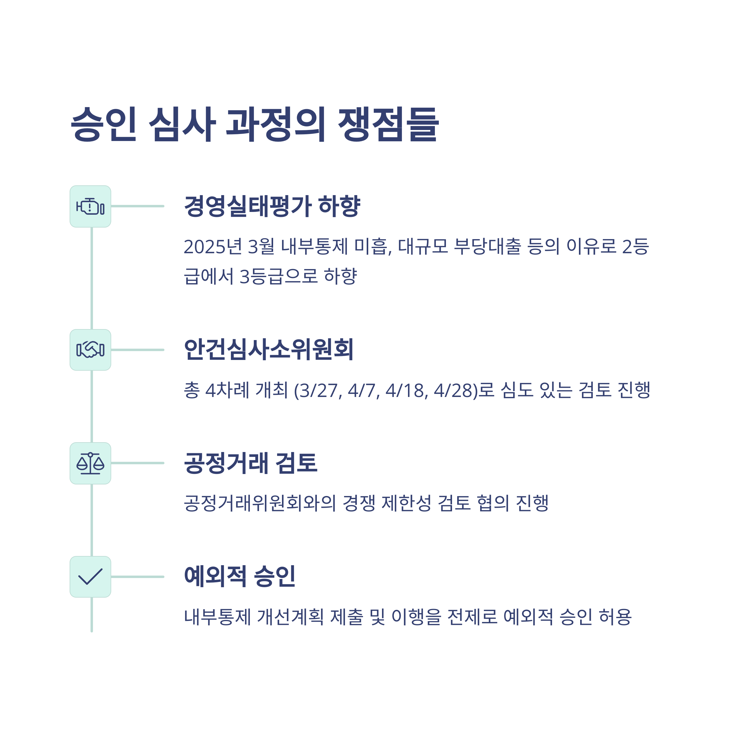 우리금융은 인수 추진 당시 금융감독원의 경영실태평가 기준인 2등급을 유지하고 있었지만, 2025년 3월 내부통제 미흡, 대규모 부당대출 등의 이유로 3등급으로 하향 조정되며 심사에 변수로 작용했습니다. 하지만 금융위는 내부통제 개선계획 제출 및 이행을 전제로 예외적 승인을 허용했으며, 다음과 같은 쟁점들을 검토했습니다.