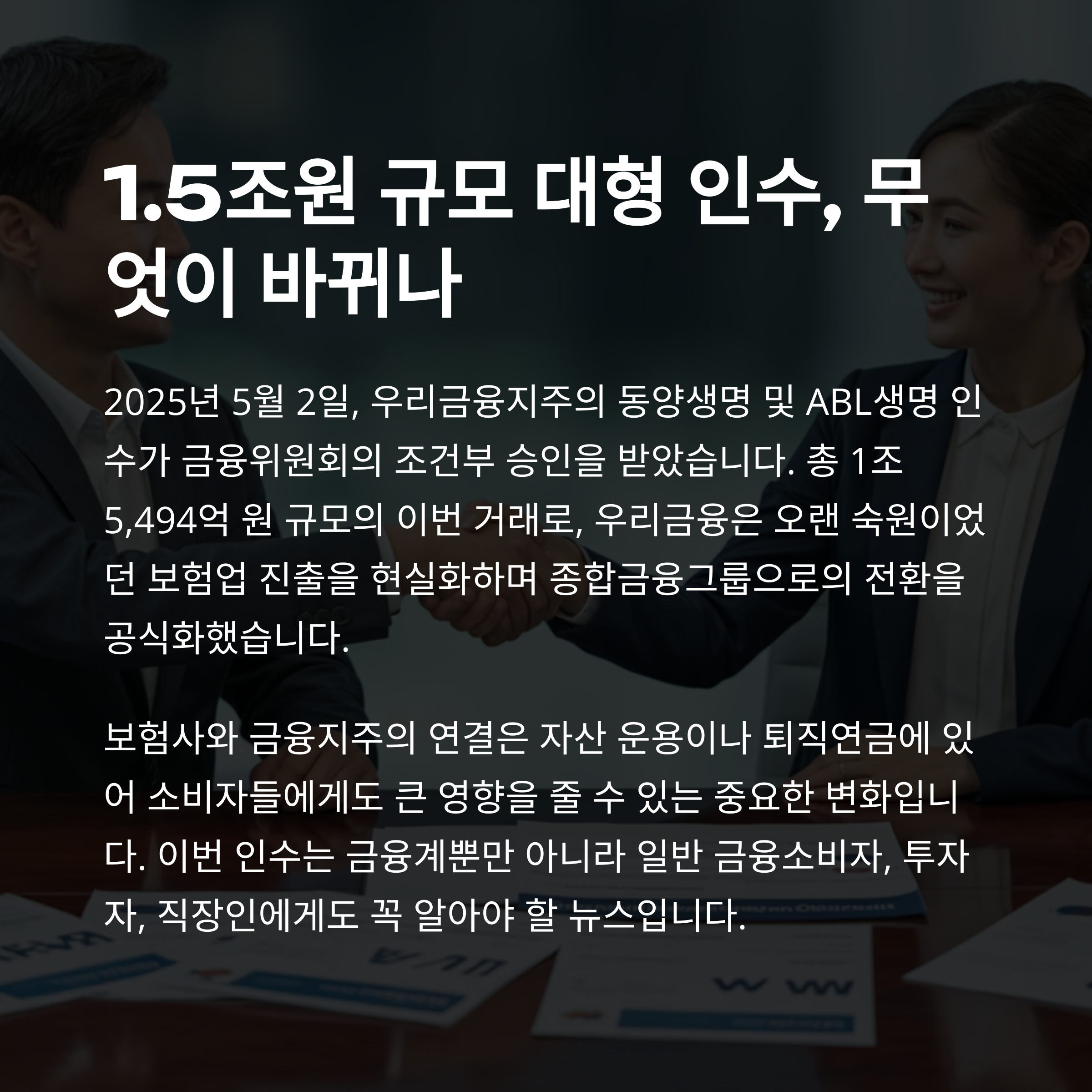 2025년 5월 2일, 우리금융지주의 동양생명 및 ABL생명 인수가 금융위원회의 조건부 승인을 받았습니다. 총 1조 5,494억 원 규모의 대형 거래로, 우리금융은 오랜 숙원이었던 보험업 진출을 현실화하며 종합금융그룹으로의 전환을 공식화했습니다. 개인적으로도 보험사와 금융지주의 연결은 자산 운용이나 퇴직연금에 있어 소비자들에게도 큰 영향을 줄 수 있어 특히 관심 있게 지켜보는 중인데요, 이번 인수는 금융계뿐만 아니라 일반 금융소비자, 투자자, 직장인에게도 꼭 알아야 할 뉴스입니다. 이 글에서는 이번 인수의 배경과 절차, 거래 구조, 조건, 업계 영향까지 알기 쉽게 정리해 드리겠습니다.