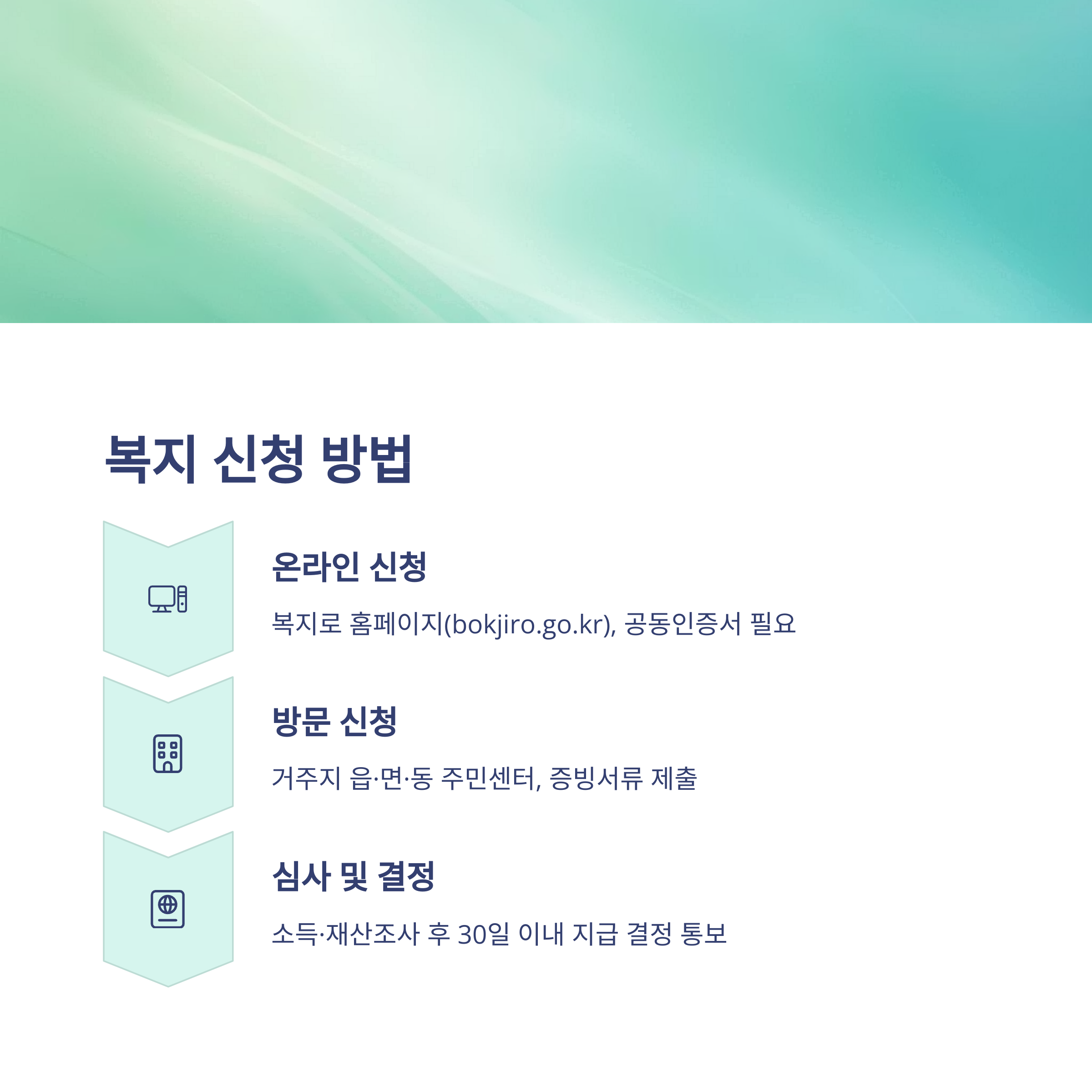- 방문 신청: 거주지 읍·면·동 주민센터에서 신청서와 증빙서류 제출.