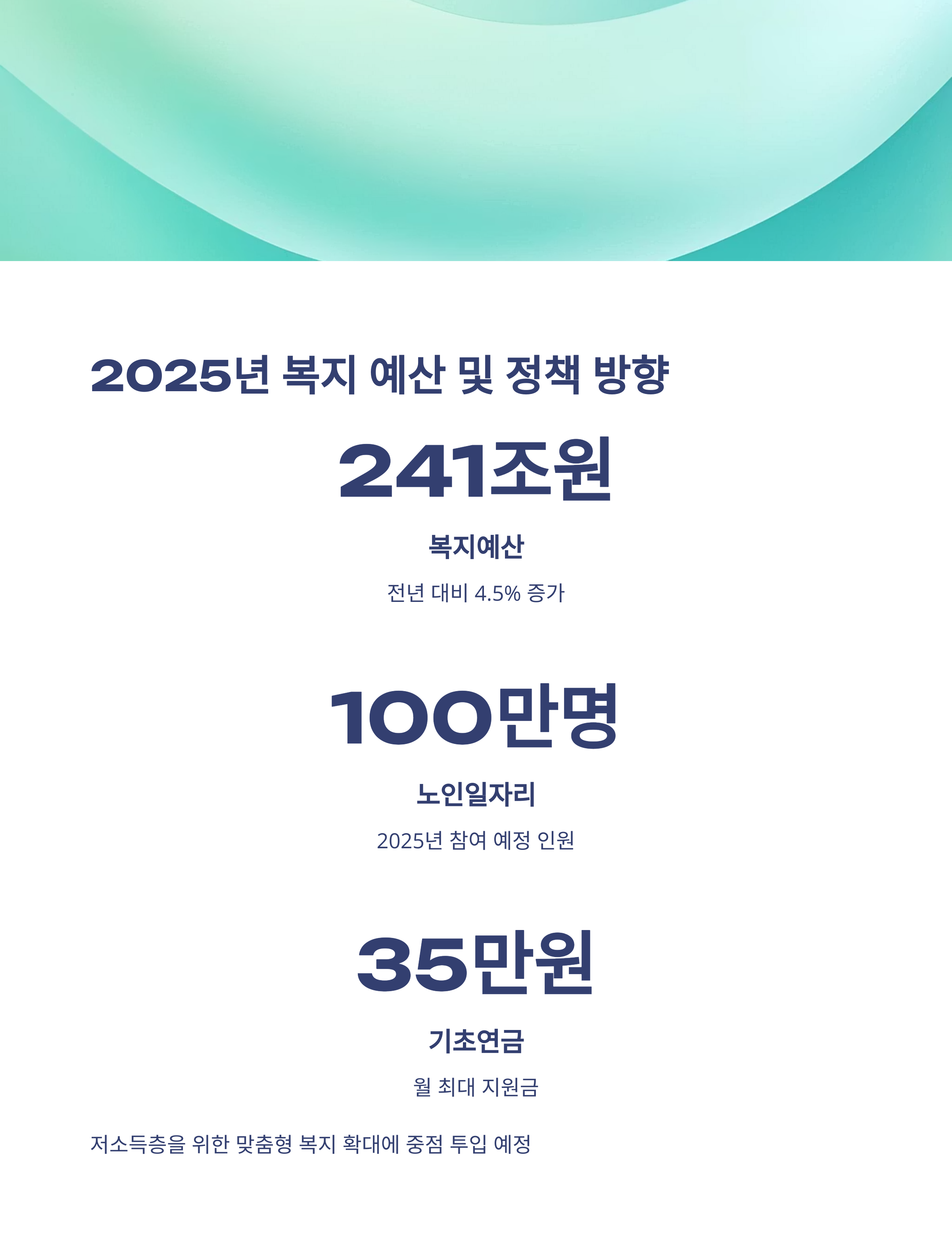 2025년 정부는 복지예산을 전년 대비 4.5% 늘린 총 241조 원으로 책정했습니다. 이 중 다수는 저소득층을 위한 맞춤형 복지 확대에 투입될 예정입니다.