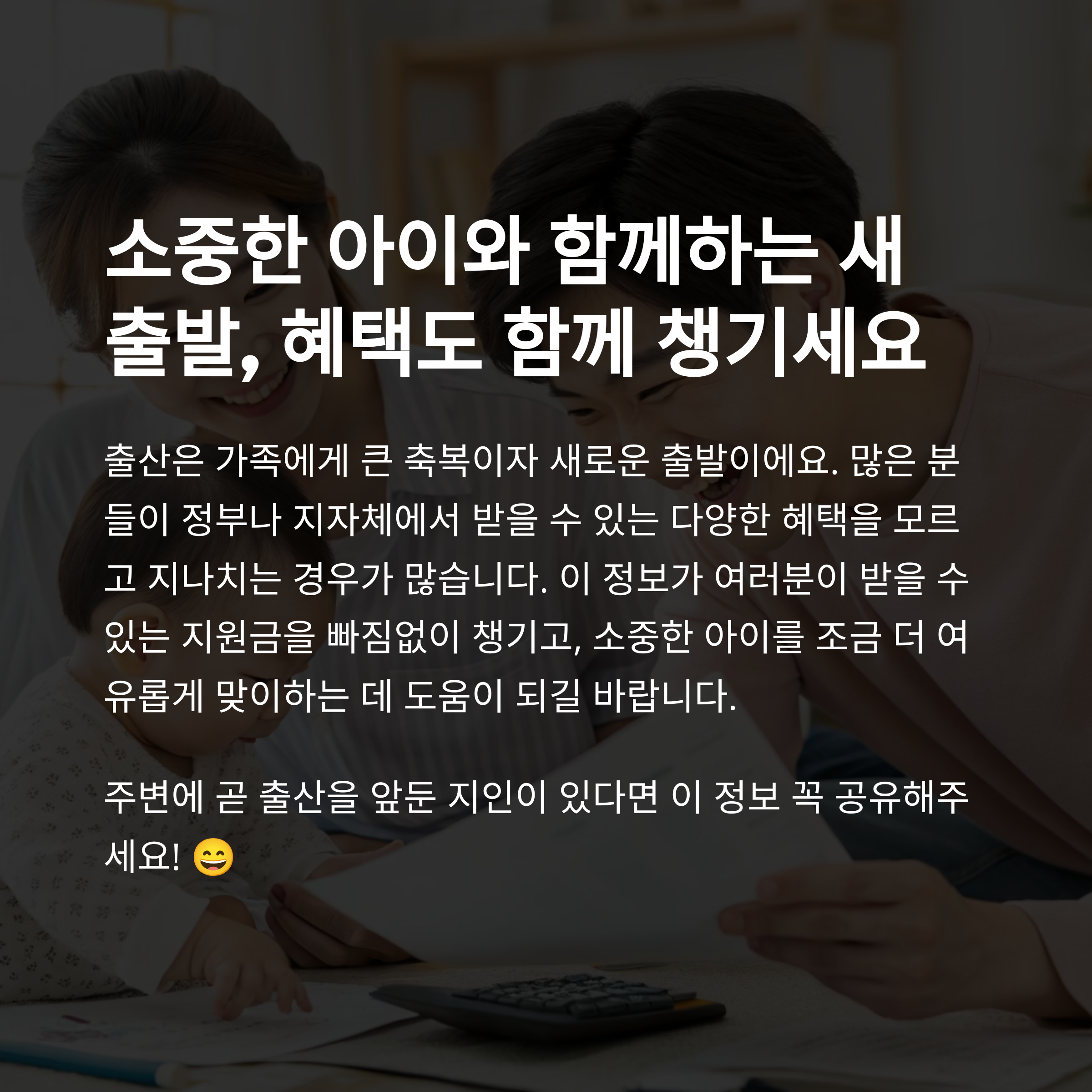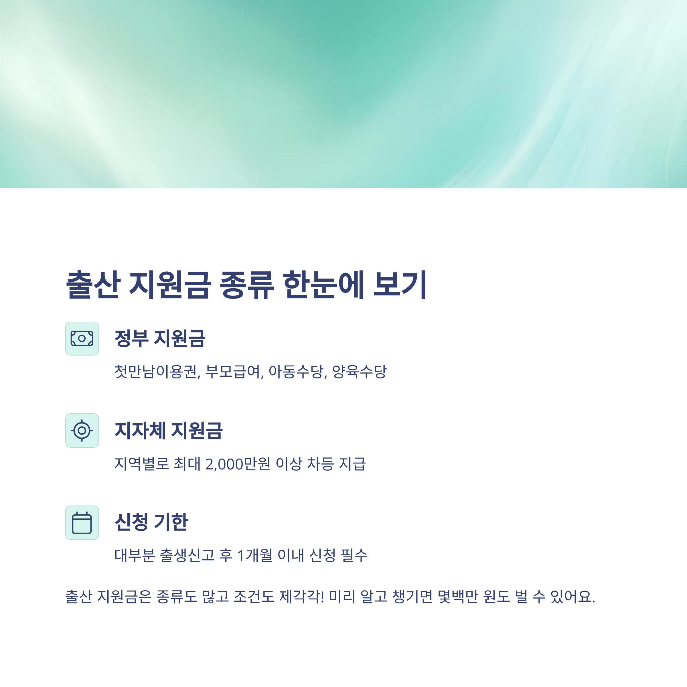 출산은 가족에게 큰 축복이자, 동시에 새로운 출발이기도 하죠. 그런데 많은 분들이 정부나 지자체에서 받을 수 있는 다양한 혜택을 모르고 지나치는 경우가 많아요. 이 글이 여러분이 받을 수 있는 지원금을 빠짐없이 챙기고, 소중한 아이를 조금 더 여유롭게 맞이하는 데 도움이 되셨길 바랍니다. 혹시 주변에 곧 출산을 앞둔 지인이 있다면 이 정보 꼭 공유해주세요! 😄