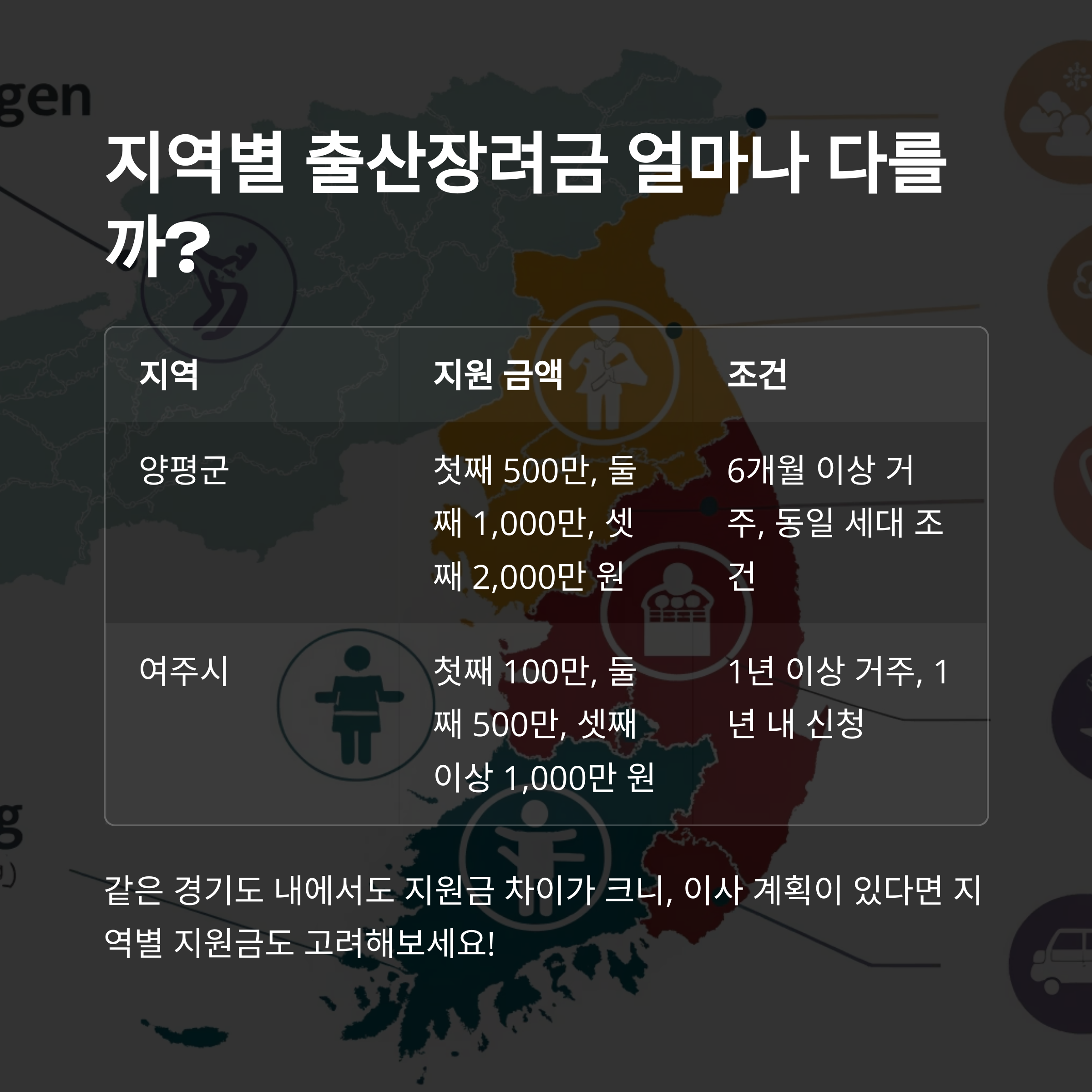 각 지역별로 천차만별인 출산장려금 제도! 같은 경기도 내에서도 양평군과 여주시의 지원 금액이 다르다는 사실, 알고 계셨나요? 일부 지자체는 1,000만 원이 넘는 지원금을 제공하기도 하고, 지급 방식도 일시금 또는 분할로 다양합니다. 주소지 요건을 충족해야 하므로 반드시 확인이 필요해요.