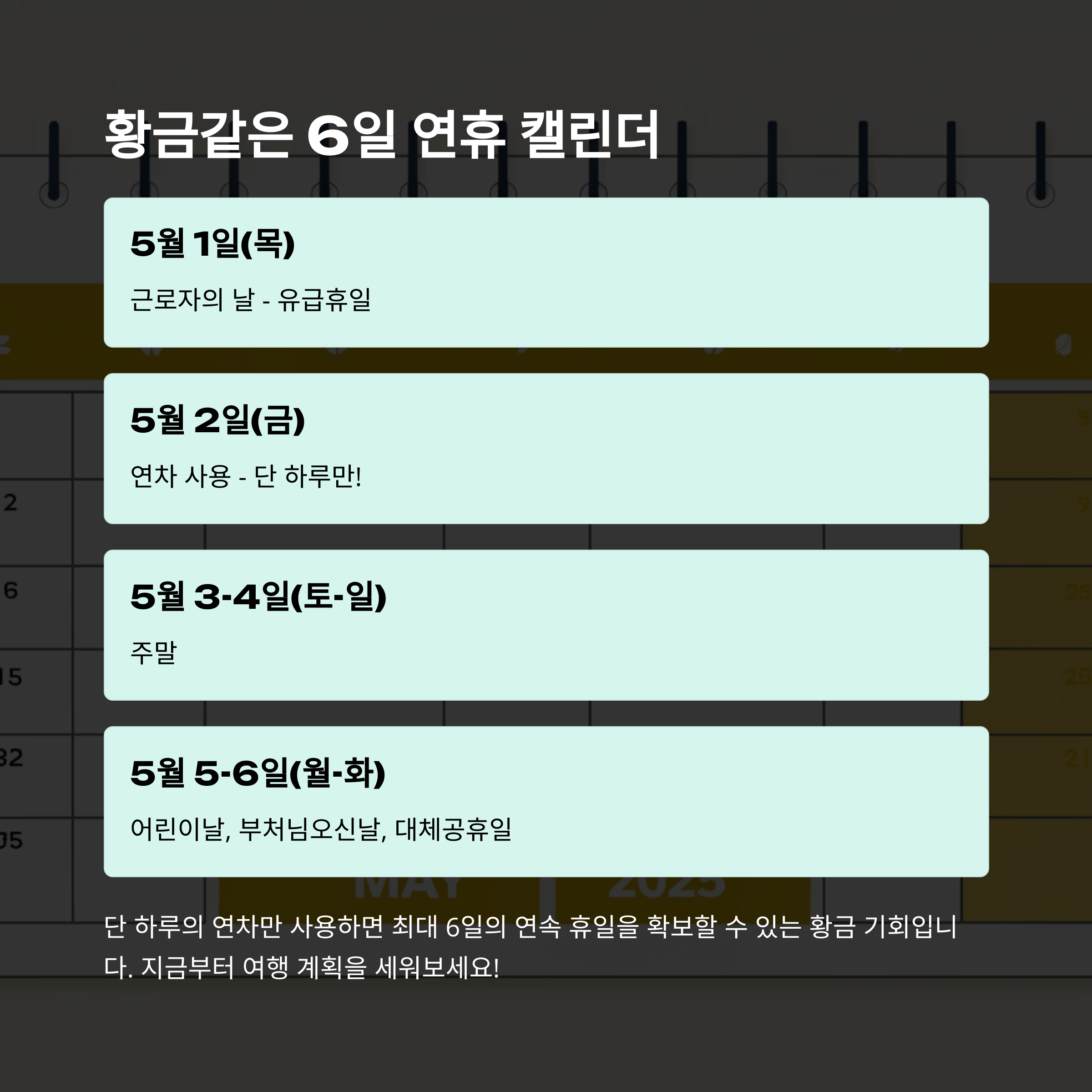 올해 5월은 말 그대로 황금입니다. 단 하루 연차만 쓰면 6일 연속 쉬는 기회! 아래 표를 참고해서 나만의 완벽한 휴가 계획을 짜보세요.