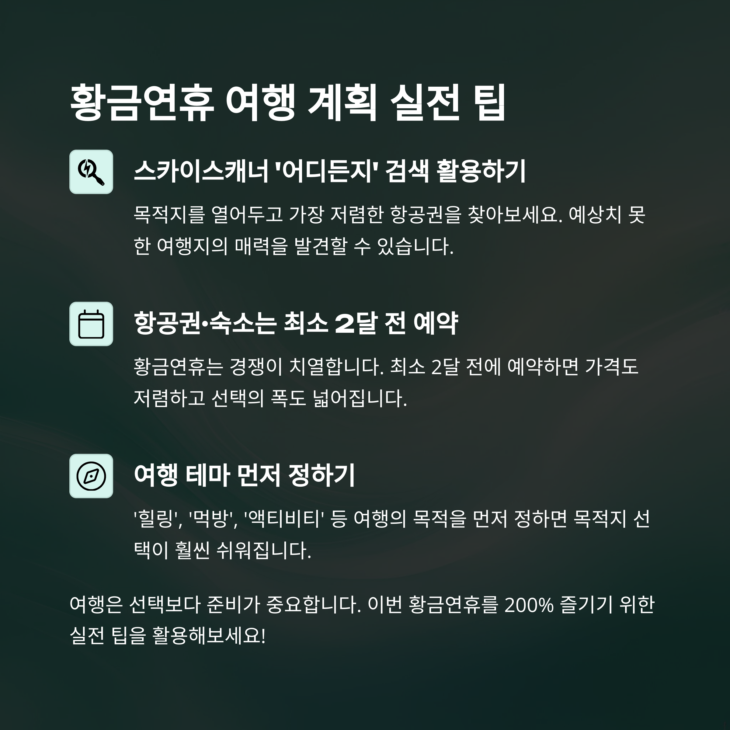 여행은 선택보다 준비가 중요하죠! 여기, 이번 황금연휴를 200% 즐기기 위한 실전 팁을 정리했습니다.