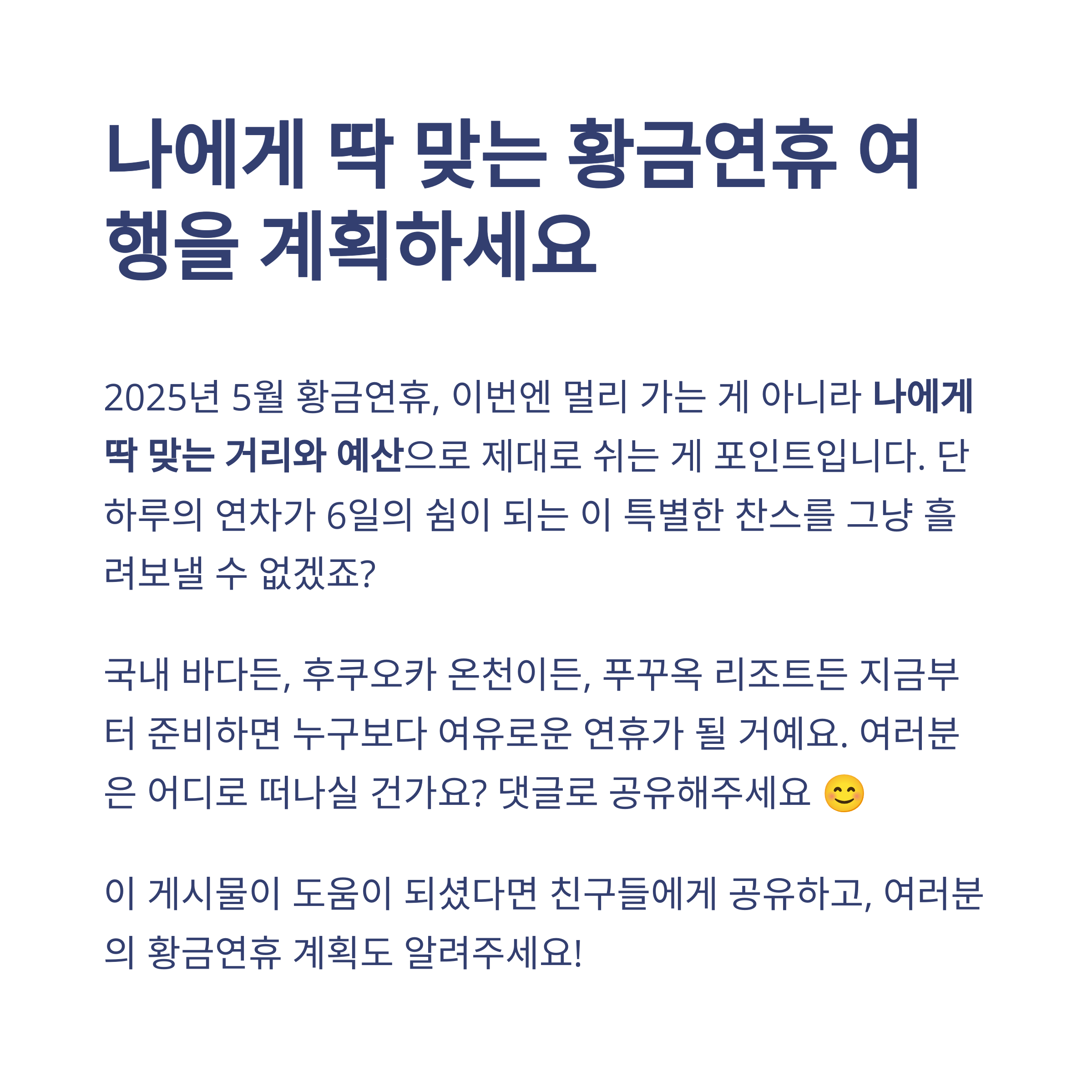 2025년 5월 황금연휴, 이번엔 멀리 가는 게 아니라 나에게 딱 맞는 거리와 예산으로 제대로 쉬는 게 포인트입니다. 단 하루의 연차가 6일의 쉼이 되는 이 특별한 찬스를 그냥 흘려보낼 수 없겠죠? 국내 바다든, 후쿠오카 온천이든, 푸꾸옥 리조트든 지금부터 준비하면 누구보다 여유로운 연휴가 될 거예요. 여러분은 어디로 떠나실 건가요? 댓글로 공유해주세요 😊