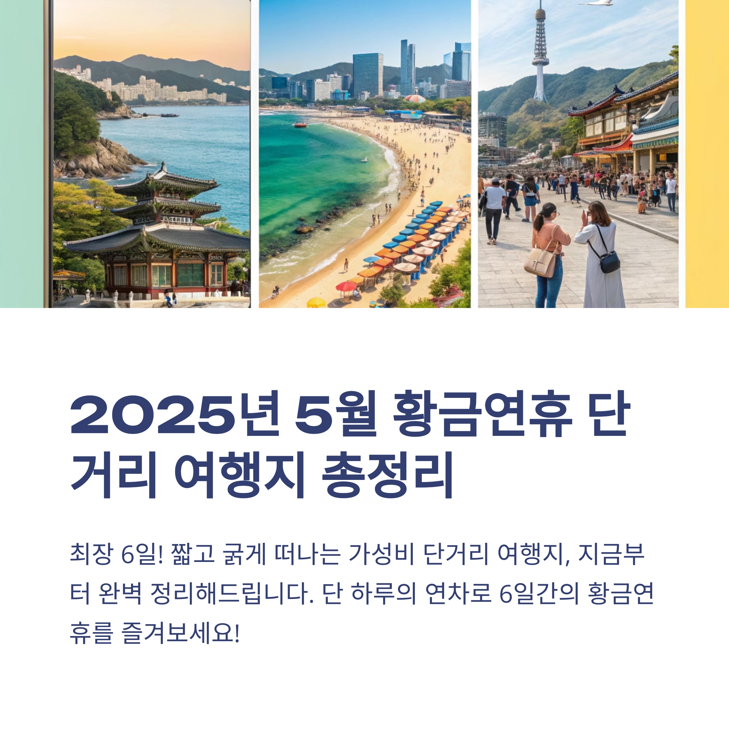 2025년 5월 황금연휴, 장거리 대신 짧지만 알찬 단거리 여행이 대세입니다. 베트남과 일본은 항공권·숙박비 모두 합리적인 수준이며, 국내도 강릉·전주 등 당일치기 혹은 1박 2일로 충분히 힐링할 수 있어요. 이번 휴일엔 ‘어디든지’ 떠나보세요. 진짜 필요한 건 ‘멀리’가 아니라 ‘지금 떠나는 것’이니까요!