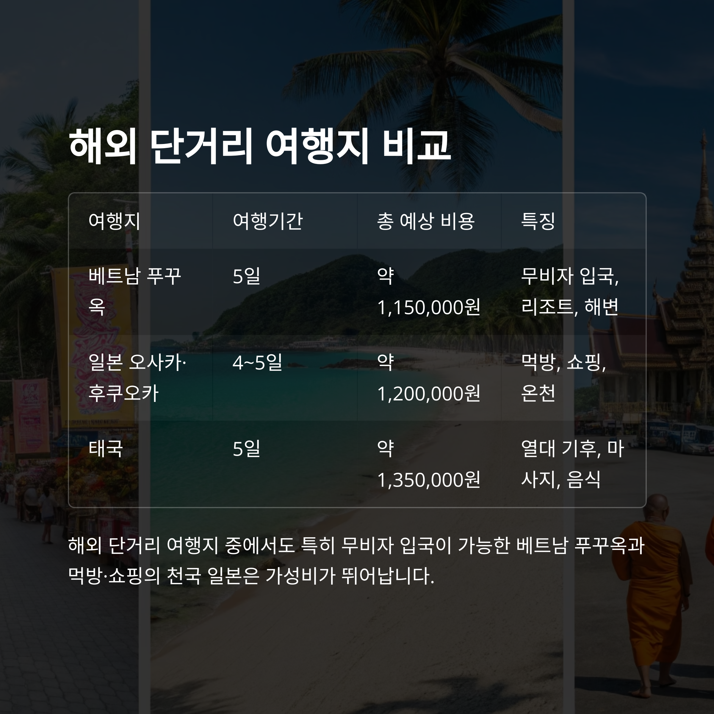 해외도 나쁘지 않죠. 특히 무비자 입국이 가능한 베트남 푸꾸옥, 먹방과 쇼핑 천국 일본 오사카·후쿠오카는 가성비 최고입니다. 아래 표에서 비용과 일정 비교해보세요.