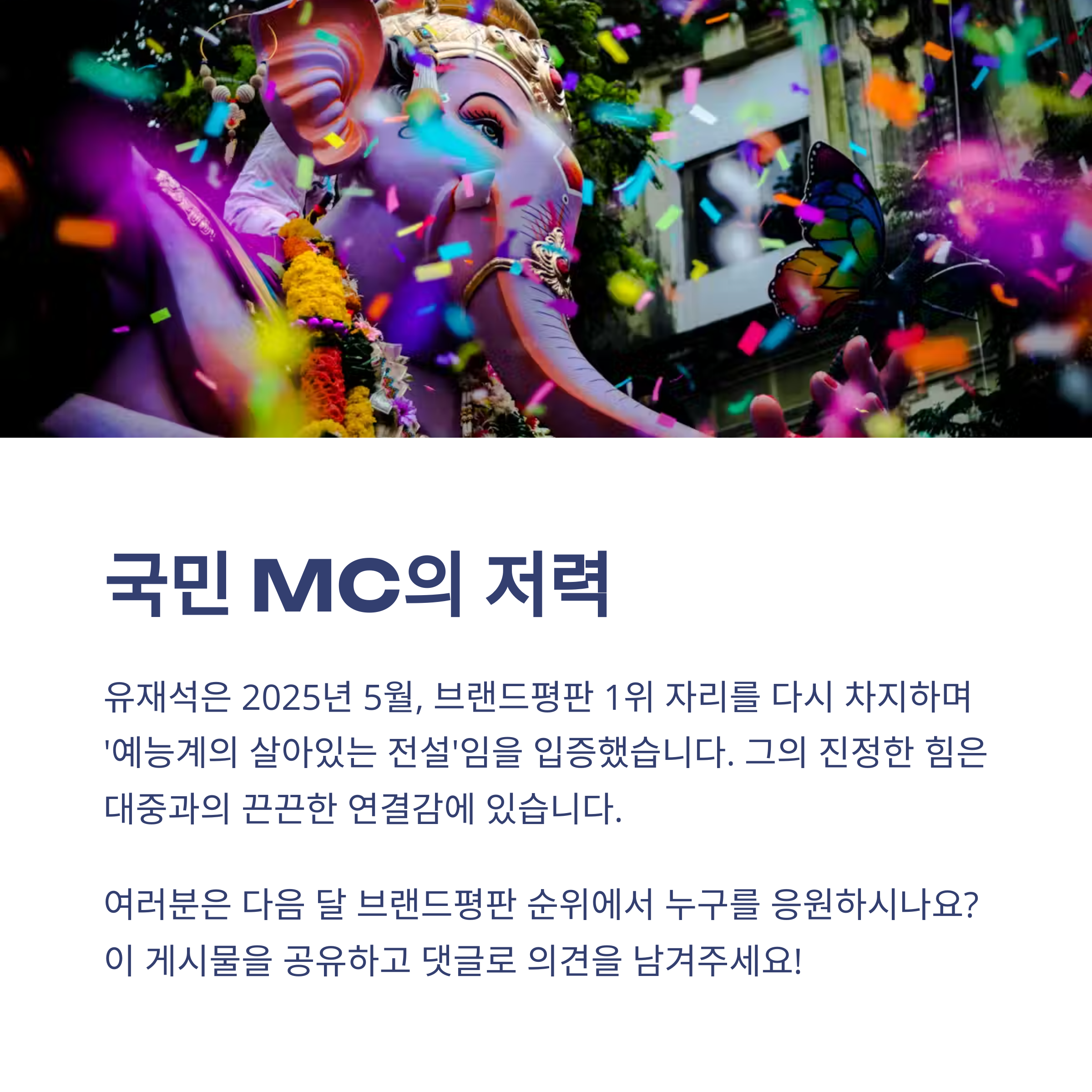 2025년 5월, 유재석은 브랜드평판 1위 자리를 다시 거머쥐며 ‘예능계의 살아 있는 전설’임을 또 한 번 입증했습니다. 숫자도 말하지만, 그의 진짜 힘은 대중과의 끈끈한 연결감이 아닐까요? 브랜드는 결국 사람이 만드는 것. 유재석이 보여준 꾸준함과 진정성은 많은 예능인에게 본보기가 되고 있습니다. 다음 달엔 또 어떤 변화가 있을지, 여러분은 누구를 응원하시나요? 댓글로 이야기 나눠보아요!