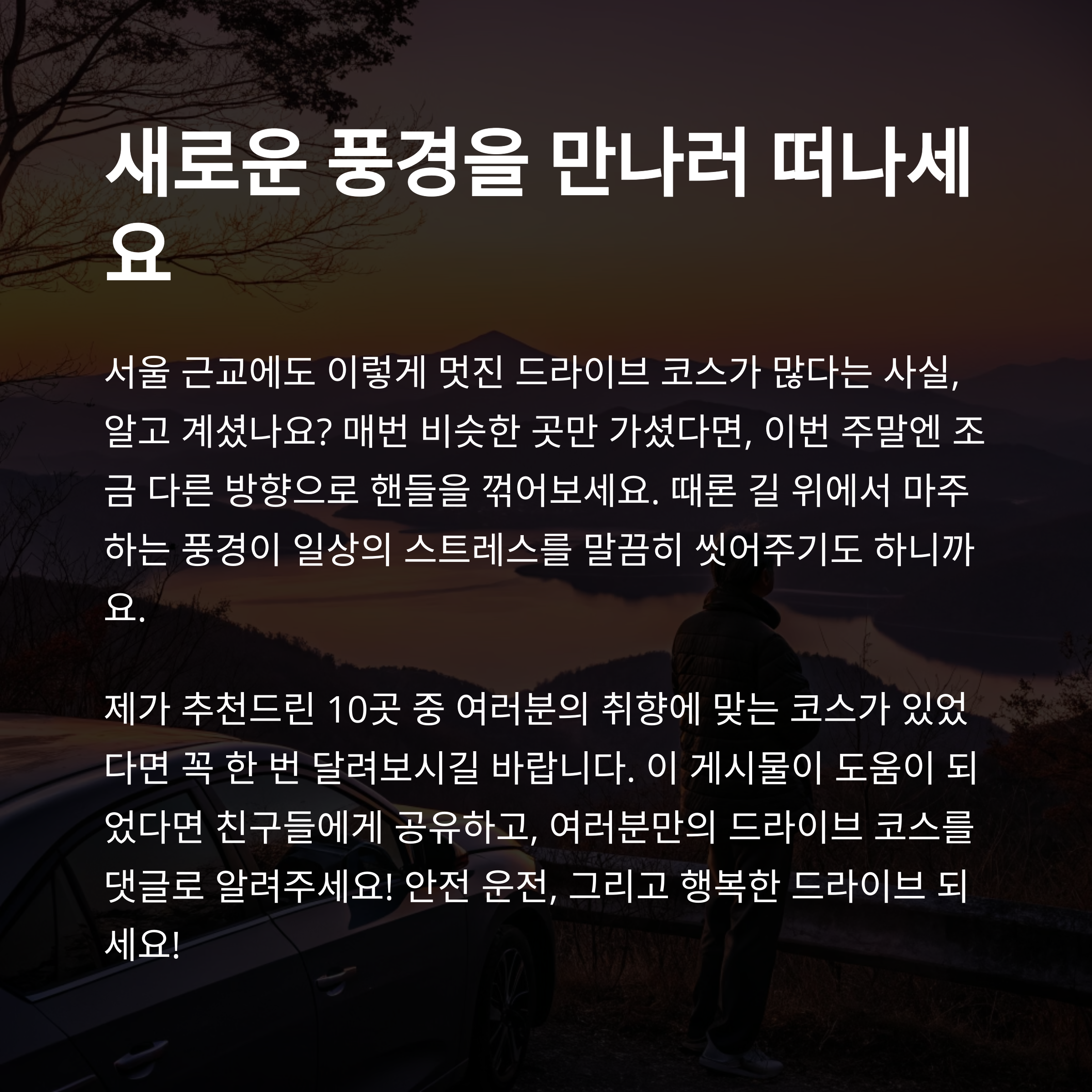 서울 근교에도 이렇게 멋진 드라이브 코스가 많다는 사실, 알고 계셨나요? 매번 비슷한 곳만 가셨다면, 이번 주말엔 조금 다른 방향으로 핸들을 꺾어보세요. 때론 길 위에서 마주하는 풍경이 일상의 스트레스를 말끔히 씻어주기도 하니까요. 제가 추천드린 10곳 중 여러분의 취향에 맞는 코스가 있었다면 꼭 한 번 달려보시길 바랍니다. 다음에는 더 멋진 여행 팁으로 찾아올게요. 안전 운전, 그리고 행복한 드라이브 되세요!