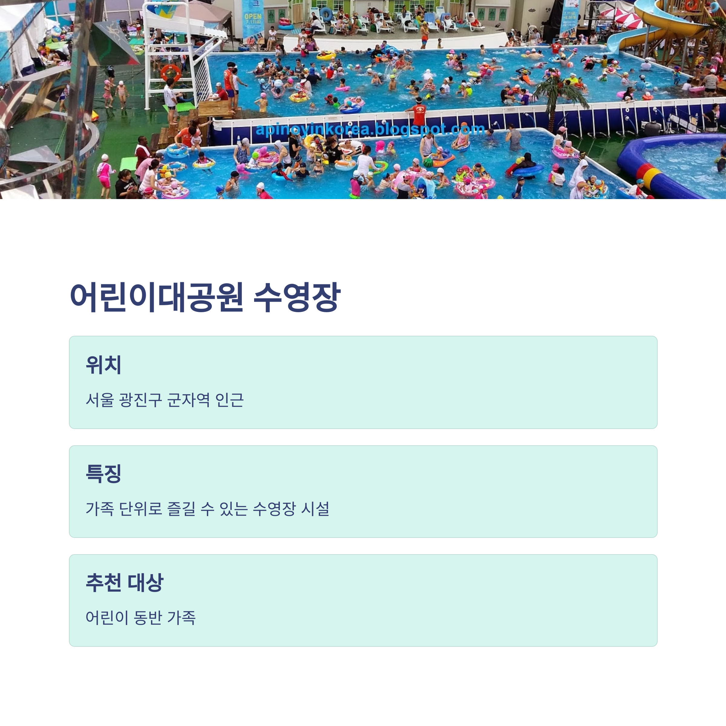 - 어린이대공원 수영장 – 가족 단위 여름 물놀이 장소로 인기