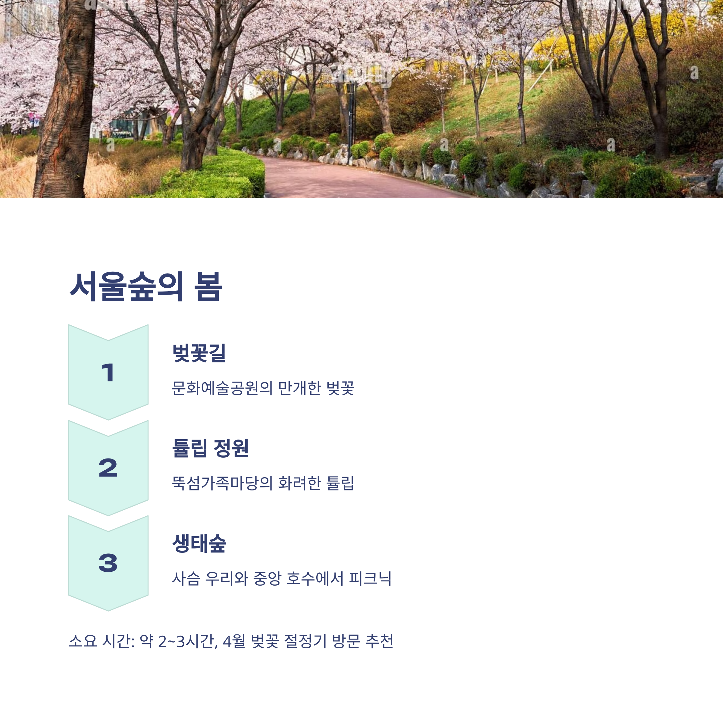 3월부터 5월까지는 서울이 가장 생기 있고 다채로운 계절입니다. 벚꽃, 튤립, 문화예술 행사 등 볼거리와 즐길 거리가 풍성한 봄의 서울은 특히 추천드릴만한 명소가 많습니다.