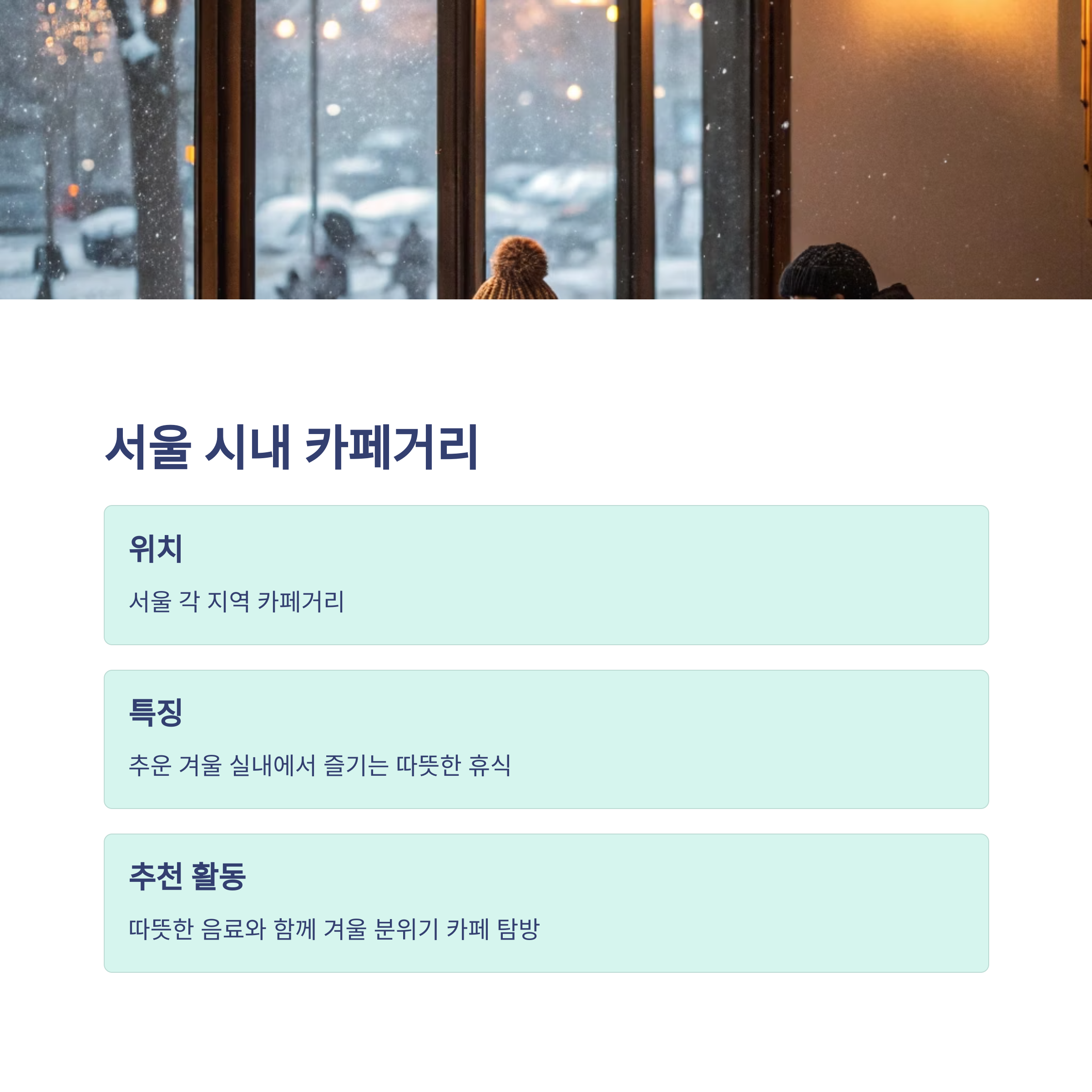- 서울 카페거리 – 실내에서 따뜻한 차 한잔과 함께하는 겨울 데이트