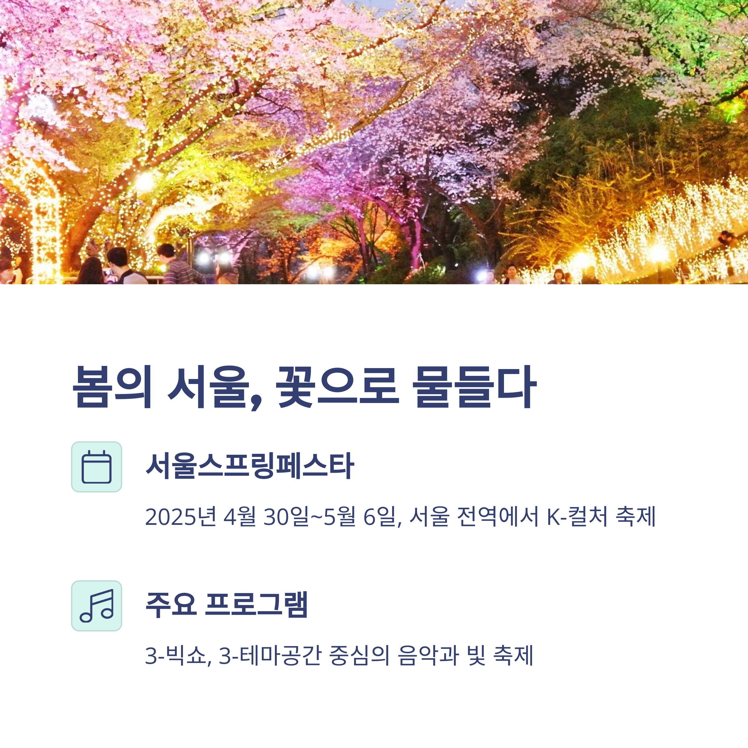 | 서울스프링페스타 | 서울 전역에서 열리는 대표 봄 축제, K-컬처와 음악의 향연 |