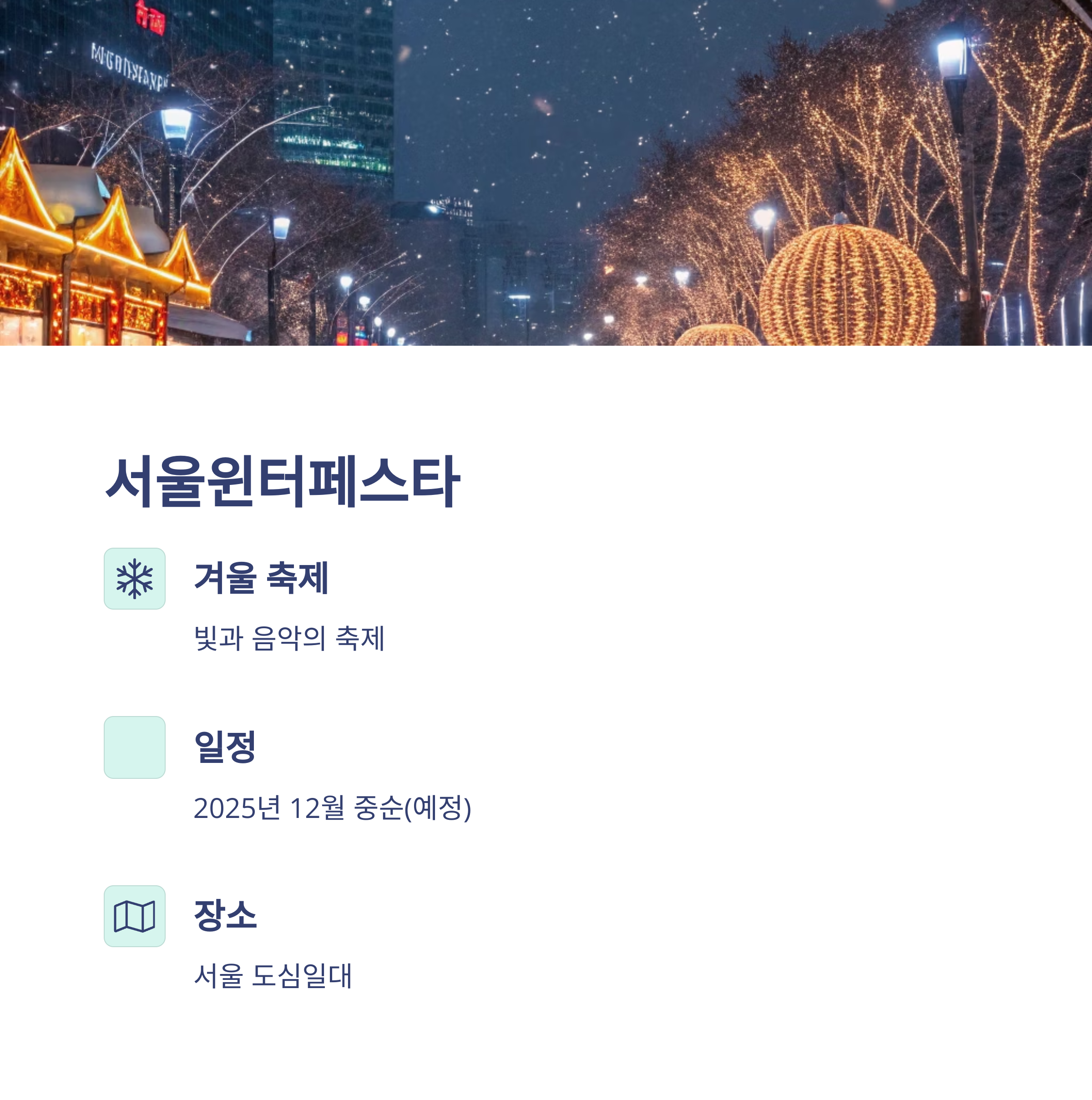 - 서울윈터페스타 – 서울 전역에서 열리는 겨울 테마의 대형 빛 축제