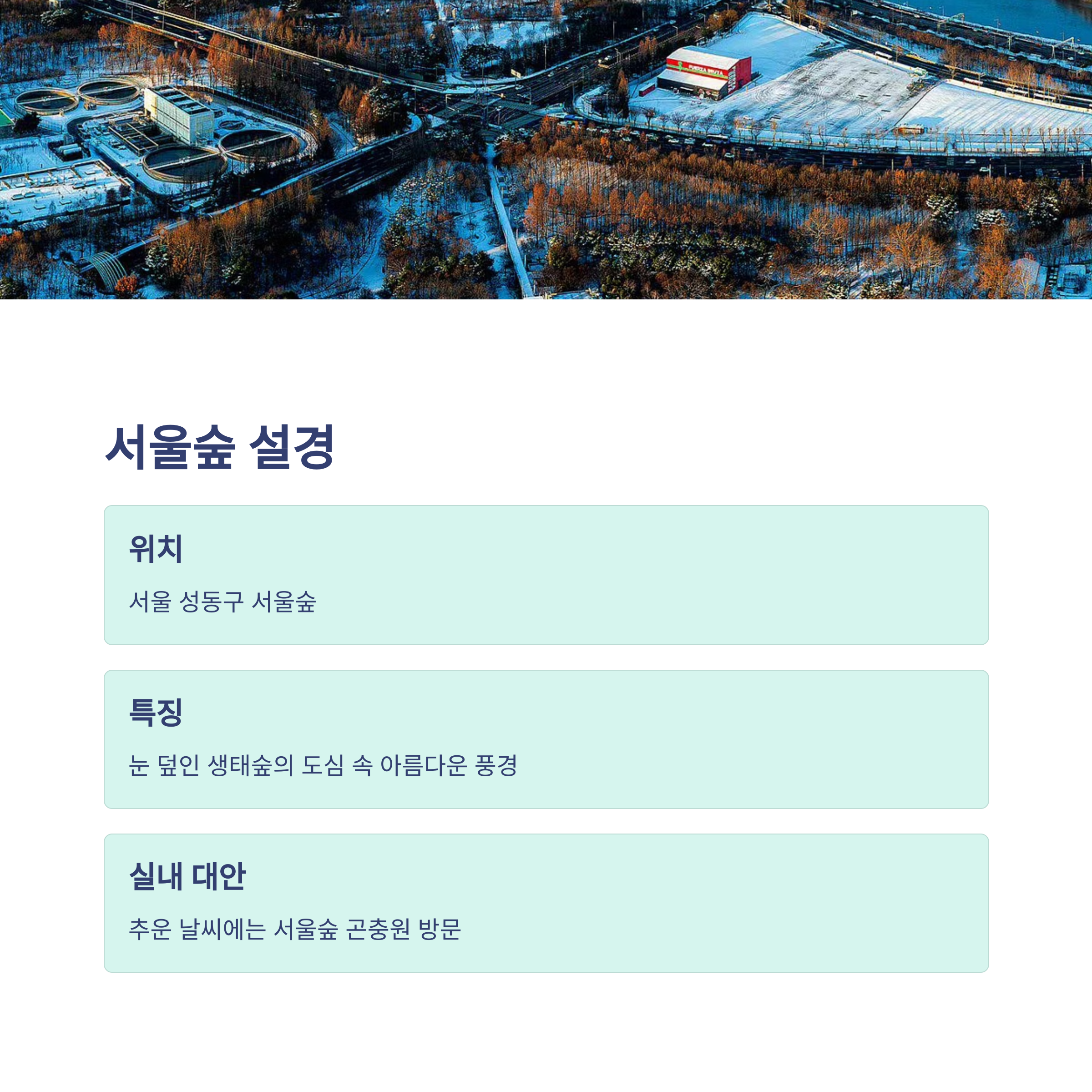 서울숲 곤충원, 실내 미술관, 감성적인 카페거리 등은 추운 날씨에도 따뜻하게 즐길 수 있는 실내 대안입니다.