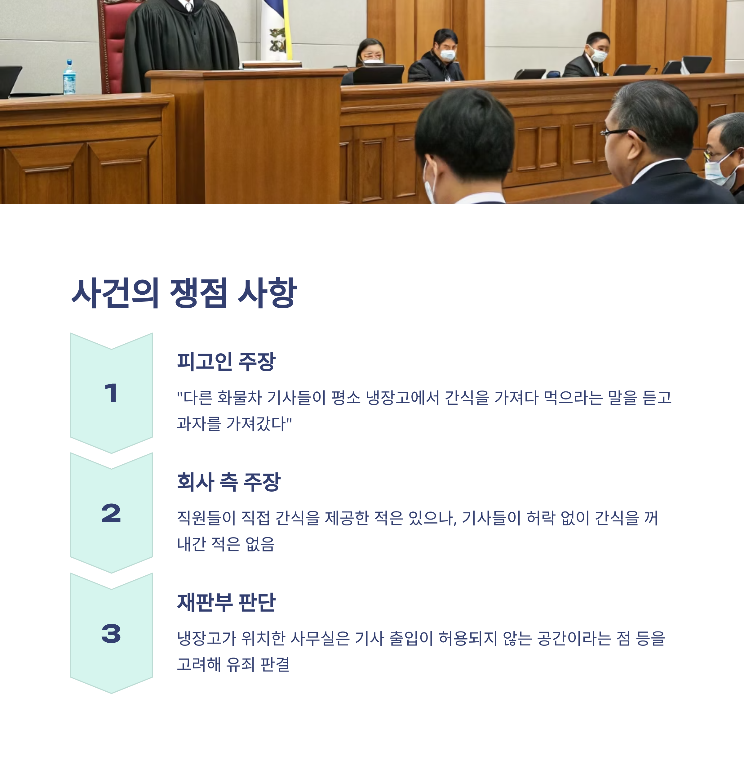 - 재판부는 냉장고가 기사 대기실과 분리되어 있고 출입이 제한된 공간이라는 점에서 유죄를 인정했습니다.