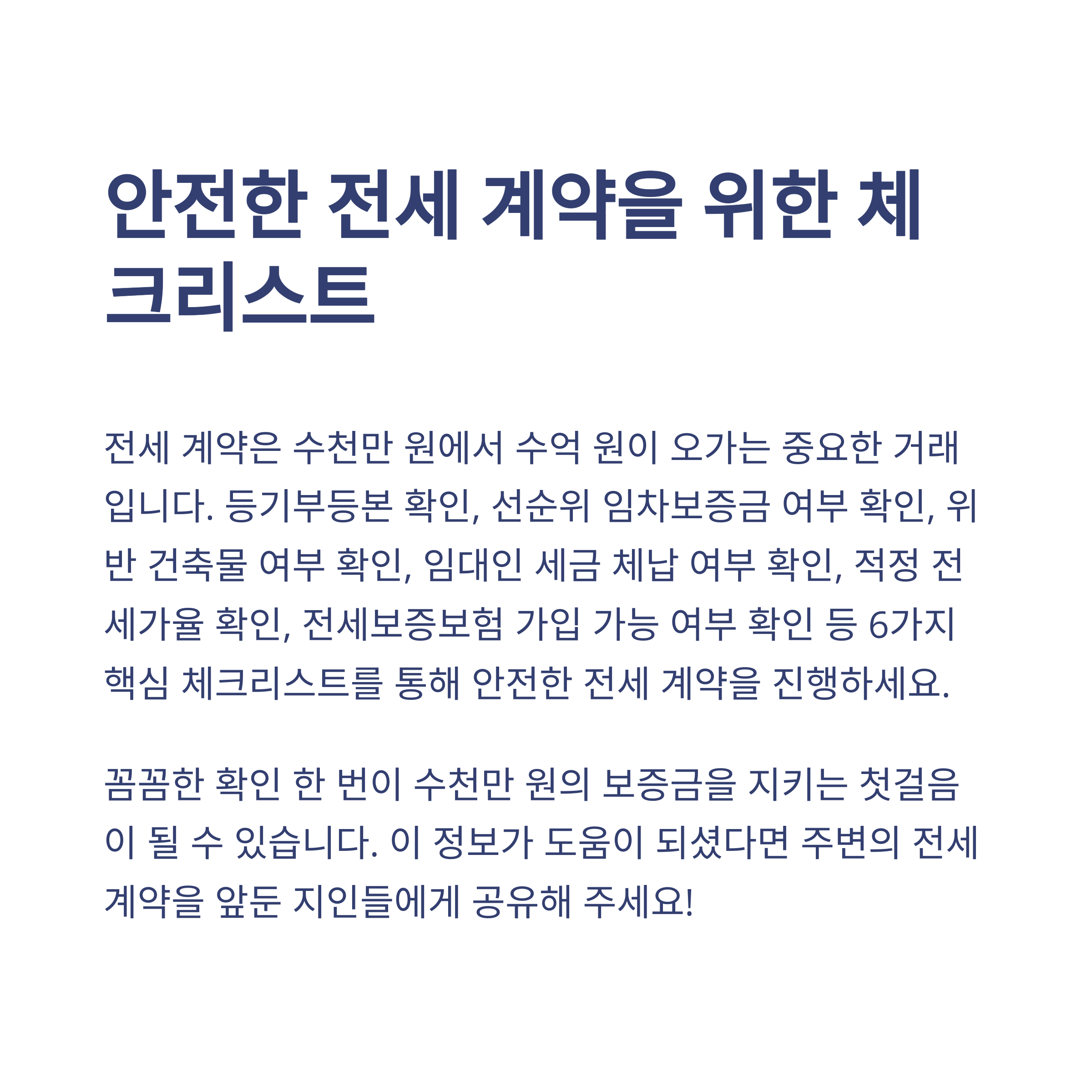 전세 계약은 인생에서 몇 안 되는 큰 재정 결정 중 하나입니다. 조금 귀찮더라도 위에서 소개한 6가지 체크리스트만 제대로 확인하면, 수천만 원에서 수억 원의 보증금을 안전하게 지킬 수 있습니다. 저 역시 이전에 전세계약을 체결할 때 전세보증보험의 존재도 몰랐던 시절이 있었는데, 지금 같았으면 절대 그런 실수는 하지 않았을 거예요. 작은 준비가 큰 차이를 만듭니다. 오늘 포스팅이 여러분의 안전한 전세 생활에 도움이 되었기를 바랍니다.😊