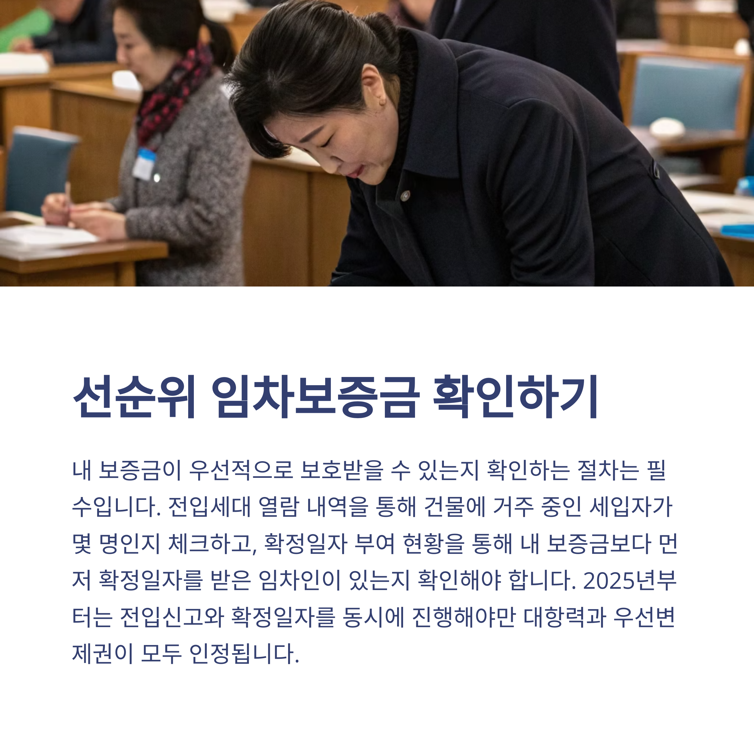 전입세대 열람과 확정일자 현황을 통해 내 보증금이 우선변제권을 가질 수 있는지를 꼭 확인해야 합니다.