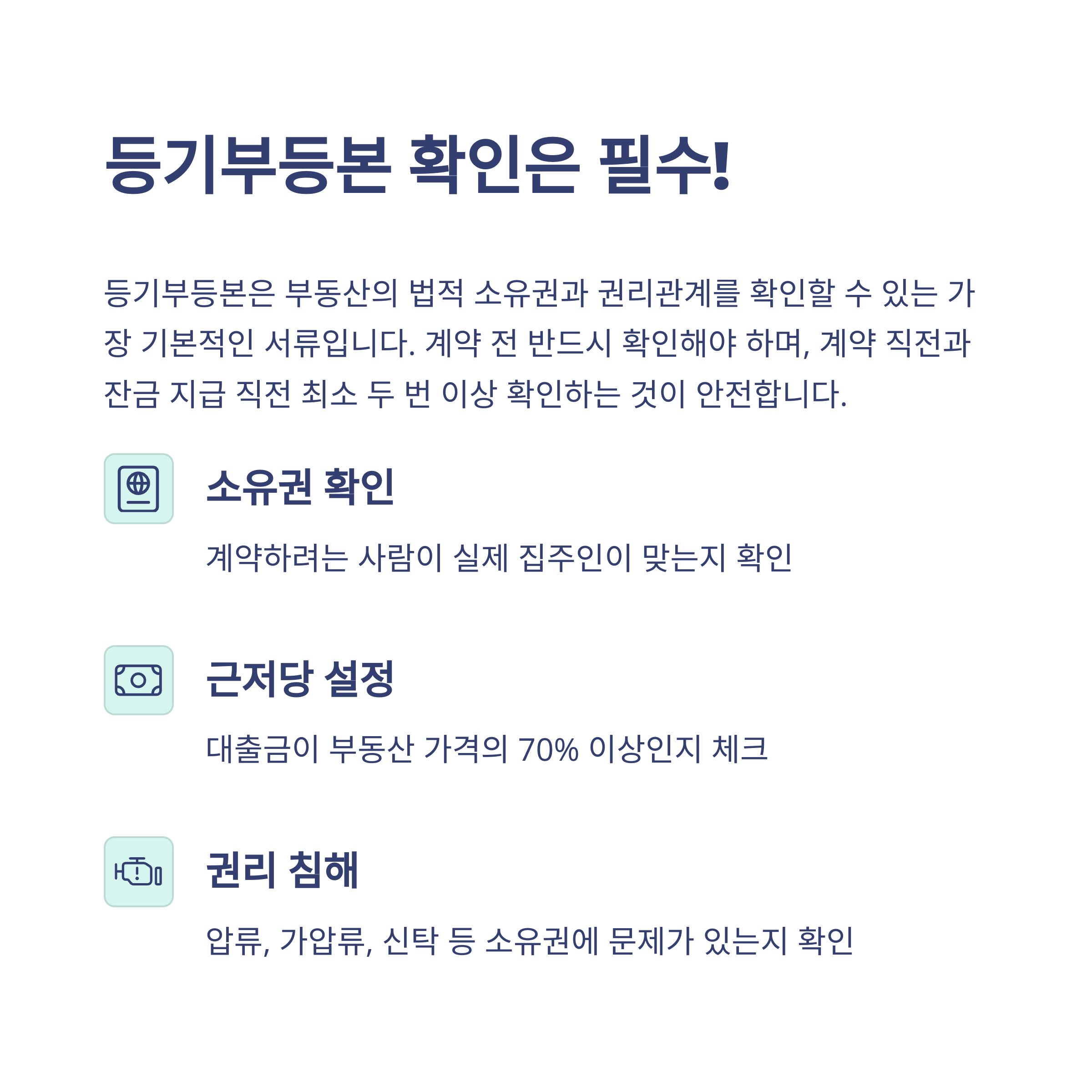 등기부등본은 해당 부동산의 소유권과 권리관계를 확인하는 가장 기본적이고 중요한 서류입니다. 계약 전뿐 아니라 잔금 지급 전에도 다시 한 번 확인해야 합니다.