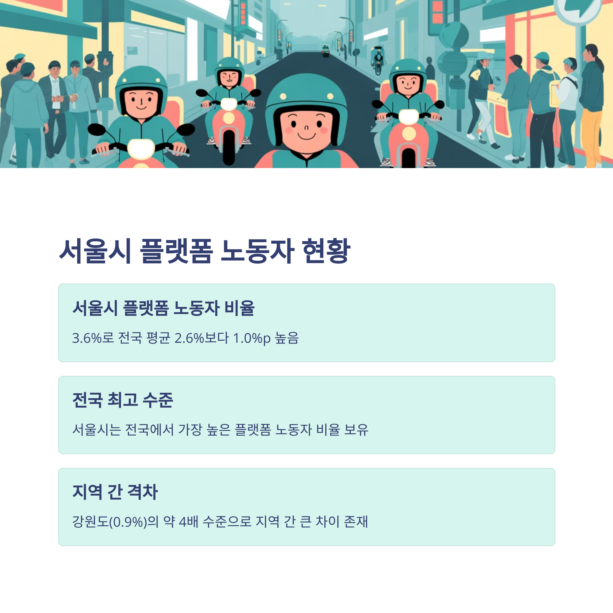 2024년 기준 전국 플랫폼 노동자는 약 88만 3천 명으로, 2021년 대비 33.6%나 증가했습니다. 특히 서울은 전국 평균보다 높은 3.6%의 플랫폼 노동자 비율을 기록하며, 전국에서 가장 많은 플랫폼 노동자가 활동하는 지역으로 떠올랐습니다. 강원도에 비해 약 4배나 높은 수치입니다.