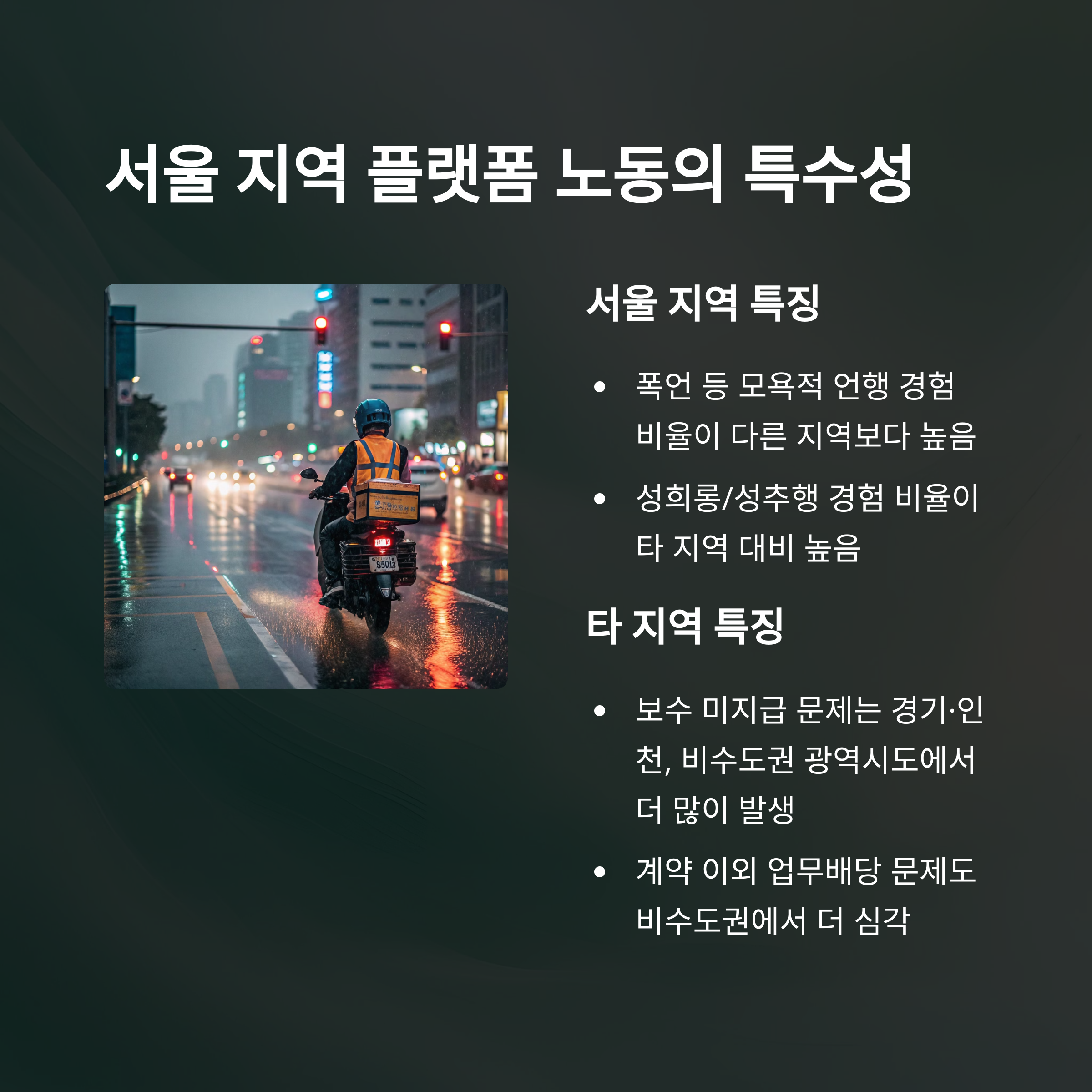 - 폭언·성희롱 비율 높음: 서울 지역은 모욕적 언행, 성희롱 경험 비율이 전국 평균보다 높음