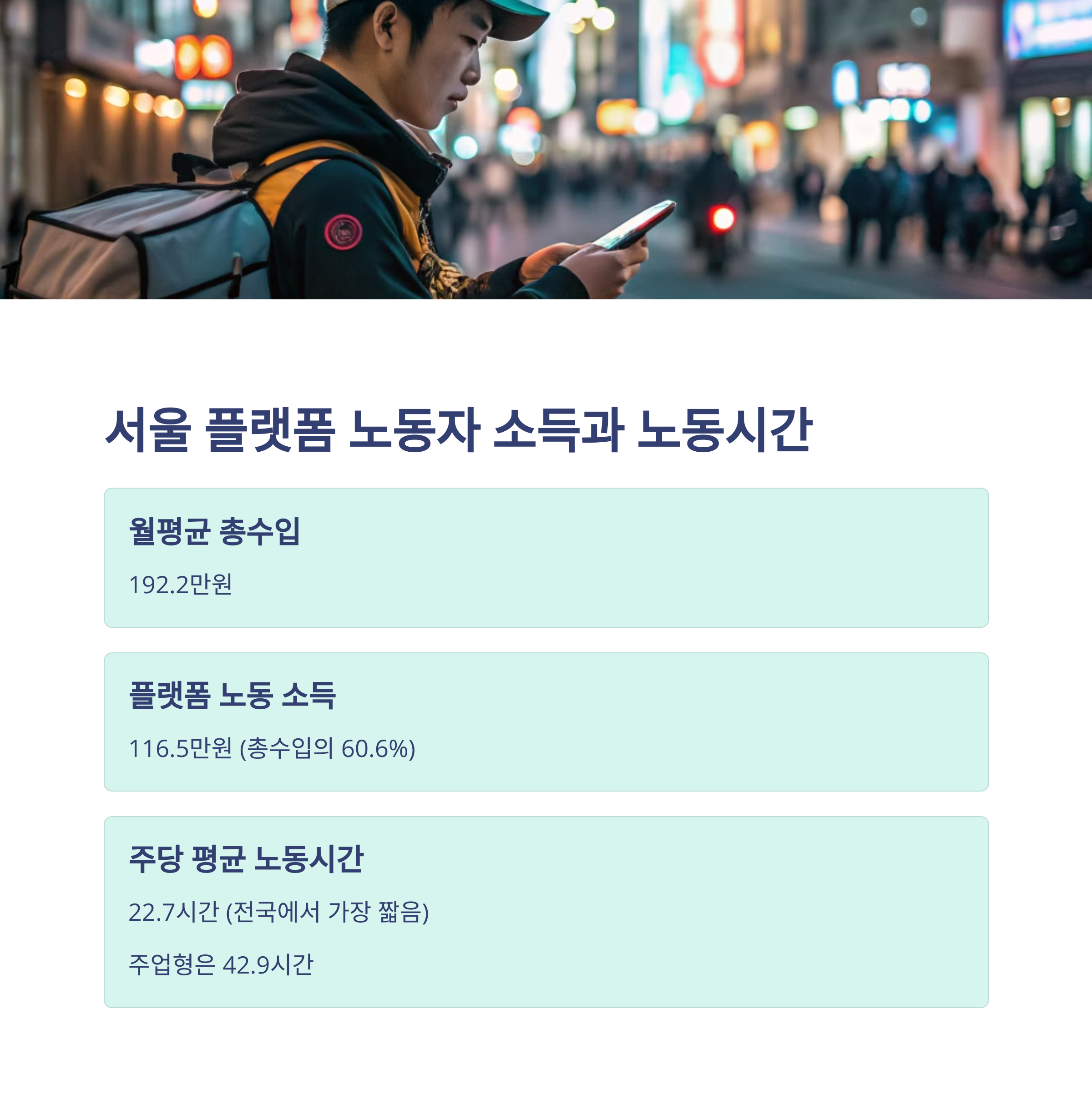 | 월평균 총수입 | 192.2만원 | 서울 플랫폼 노동자 평균 |