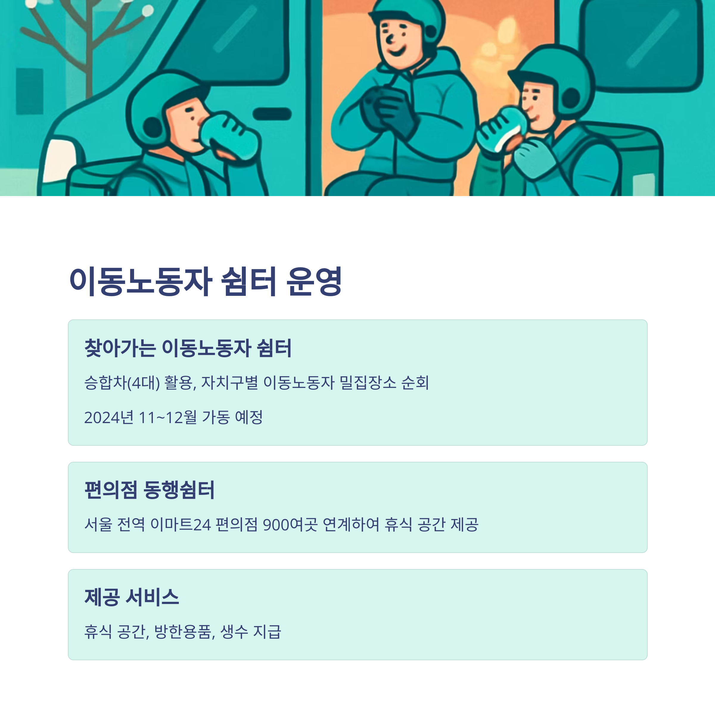 - 이동노동자 쉼터: 편의점 연계·승합차 순회형 쉼터 운영 (2024년 말부터)