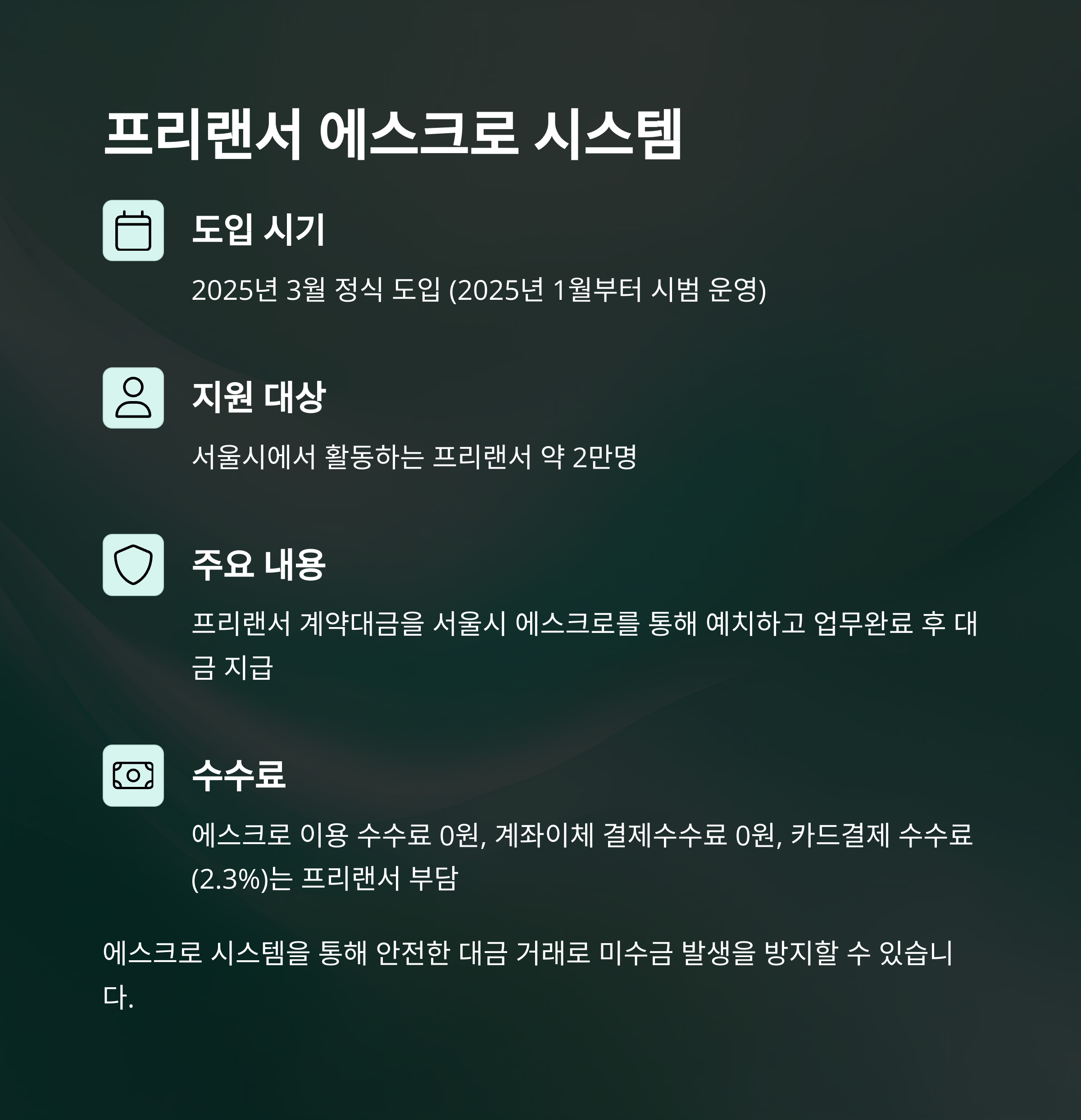 - 프리랜서 에스크로 도입: 2025년 3월 도입, 계약금 미수 방지를 위한 제도