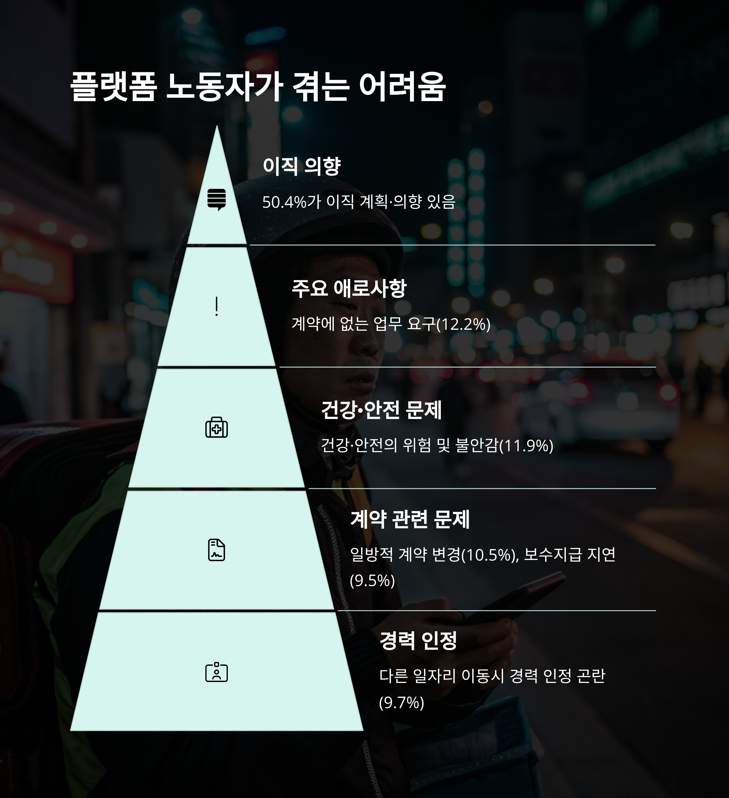 - 이직 의향: 50.4%의 플랫폼 노동자가 향후 이직을 고려