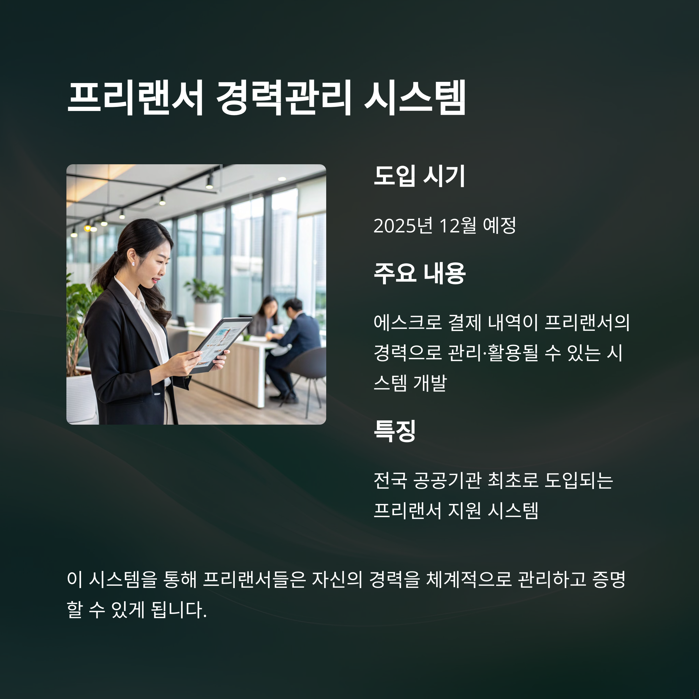 - 2025년 도입되는 에스크로 시스템과 경력관리 시스템은 전국 최초 시도로 프리랜서의 소득 안정성과 신뢰 기반 조성에 기여할 전망