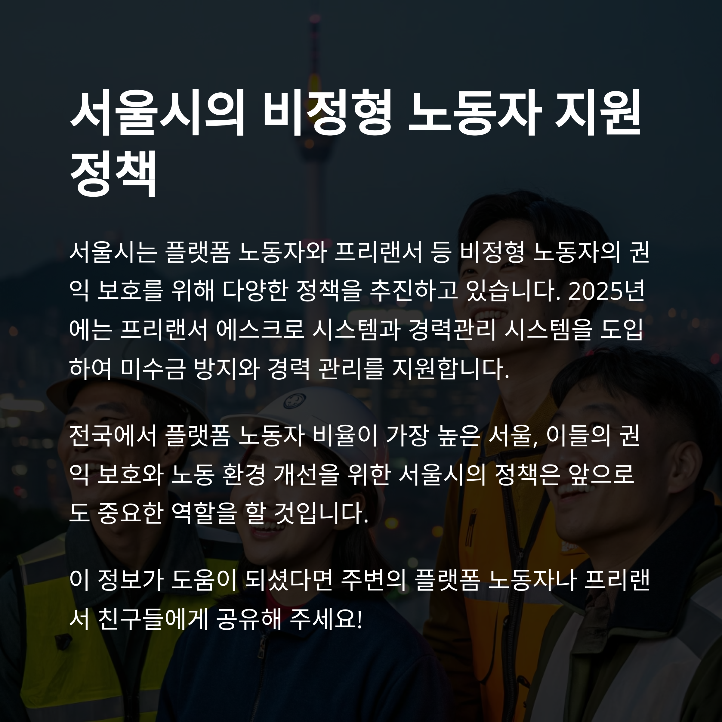 플랫폼노동자, 프리랜서정책, 서울시지원, 에스크로시스템, 경력관리, 이동노동자쉼터, 비정형노동자, 노동자권익, 프리랜서대금보호, 노동환경개선