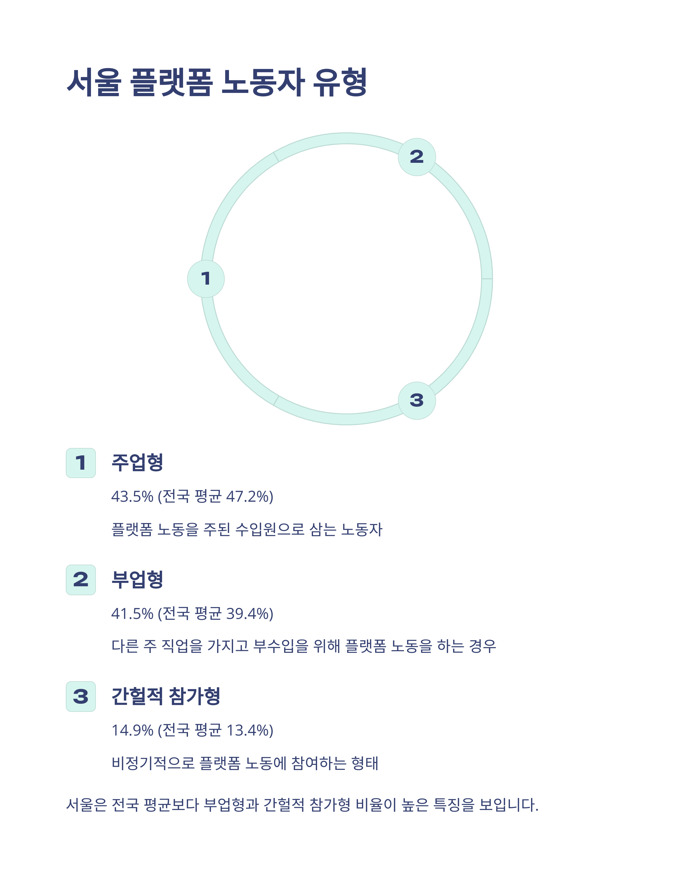 플랫폼 노동은 주업으로 삼는 경우도 있지만, 부업 또는 간헐적으로 참여하는 형태도 많습니다. 서울의 경우, 주업형은 43.5%, 부업형은 41.5%, 간헐적 참가형은 14.9%로 구성돼 있습니다.