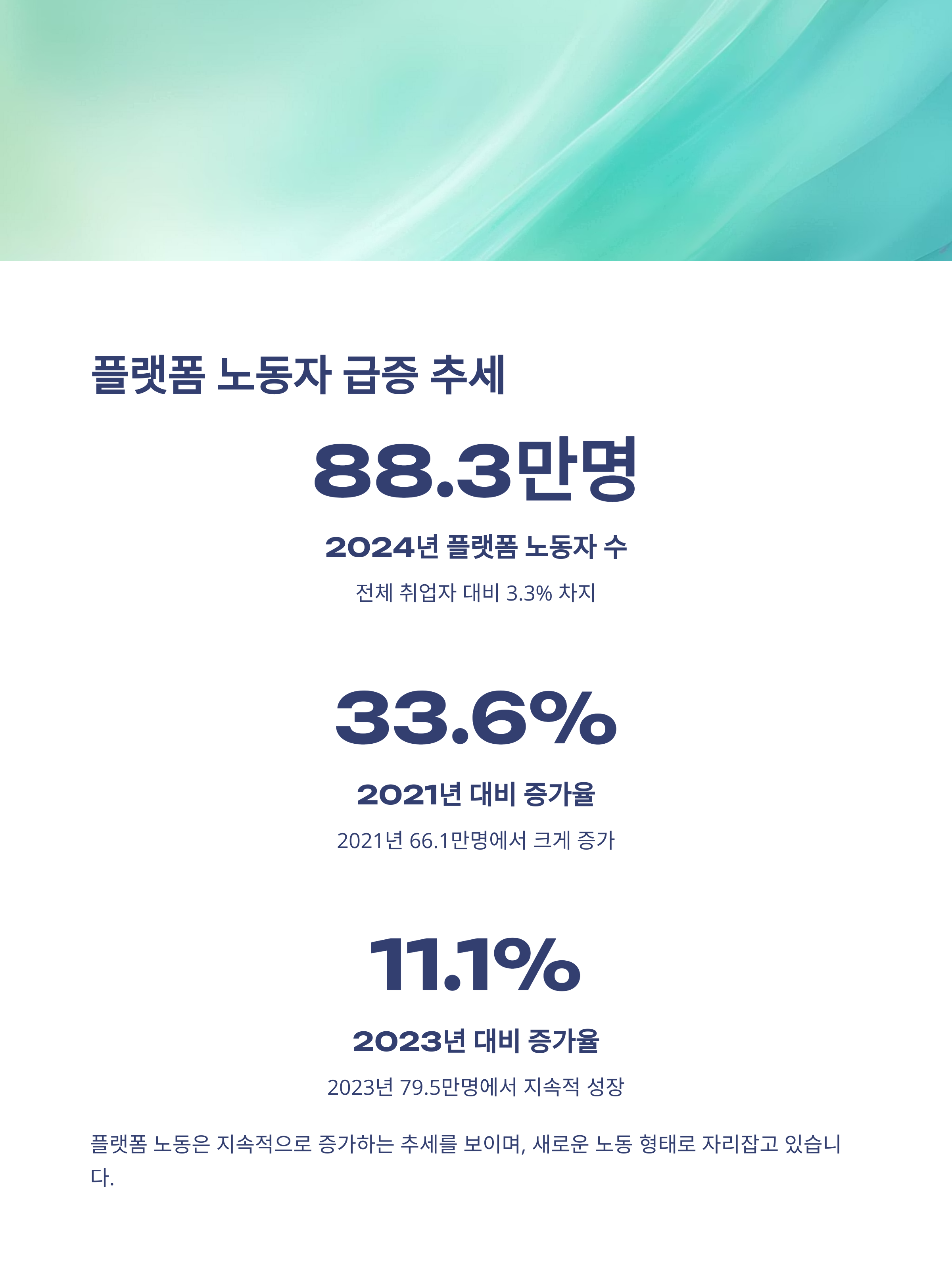 2024년 기준 전국 플랫폼 노동자는 약 88만 3천 명으로, 2021년 대비 33.6%나 증가했습니다. 특히 서울은 전국 평균보다 높은 3.6%의 플랫폼 노동자 비율을 기록하며, 전국에서 가장 많은 플랫폼 노동자가 활동하는 지역으로 떠올랐습니다. 강원도에 비해 약 4배나 높은 수치입니다.
