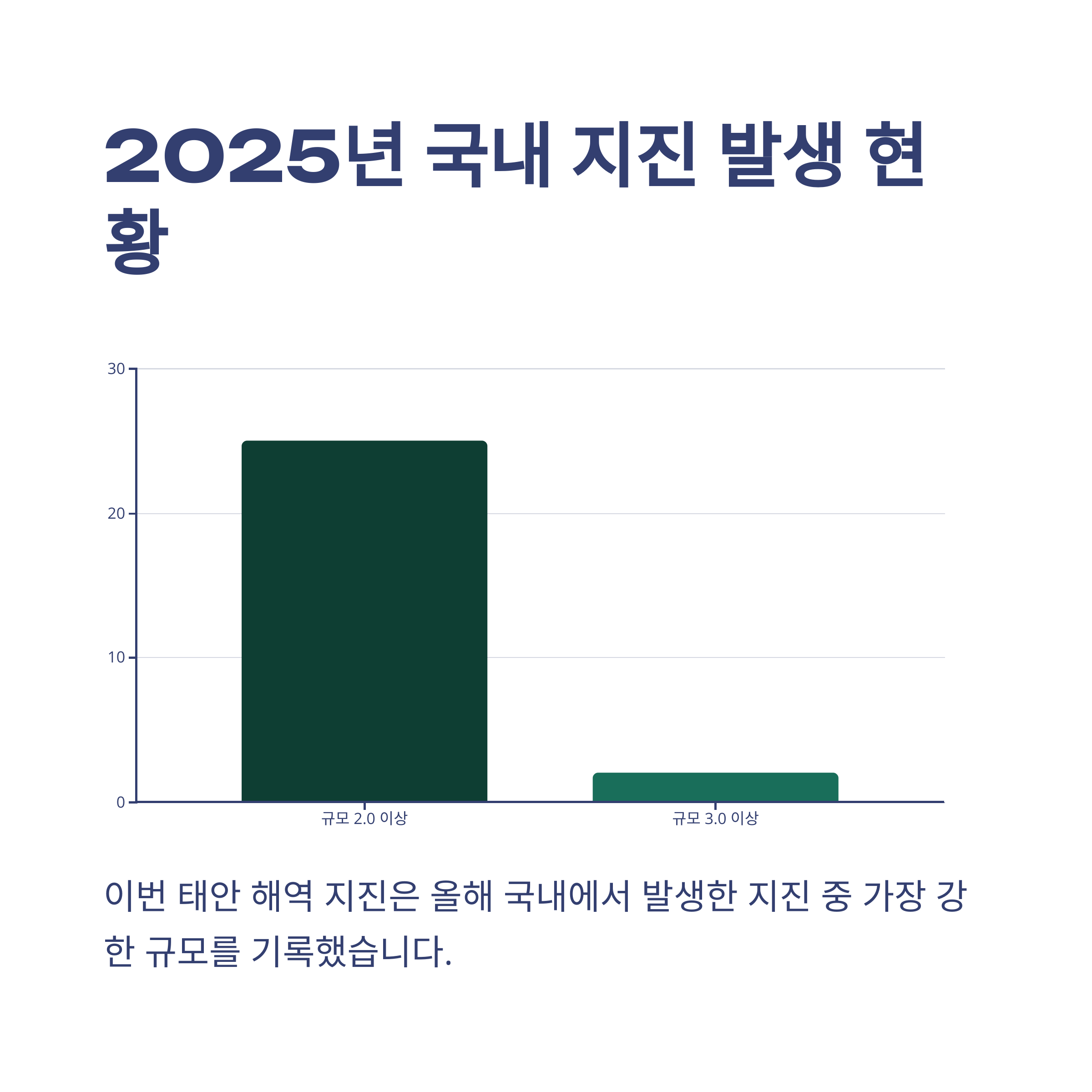 2025년 현재까지 우리나라에서 발생한 규모 2.0 이상의 지진은 총 25차례이며, 이 중 규모 3.0 이상은 단 두 번뿐입니다. 특히 이번 태안 해역 지진은 이 중에서도 가장 강력한 규모를 기록하며 지진 경보체계와 국민의 경각심을 환기시켰습니다.