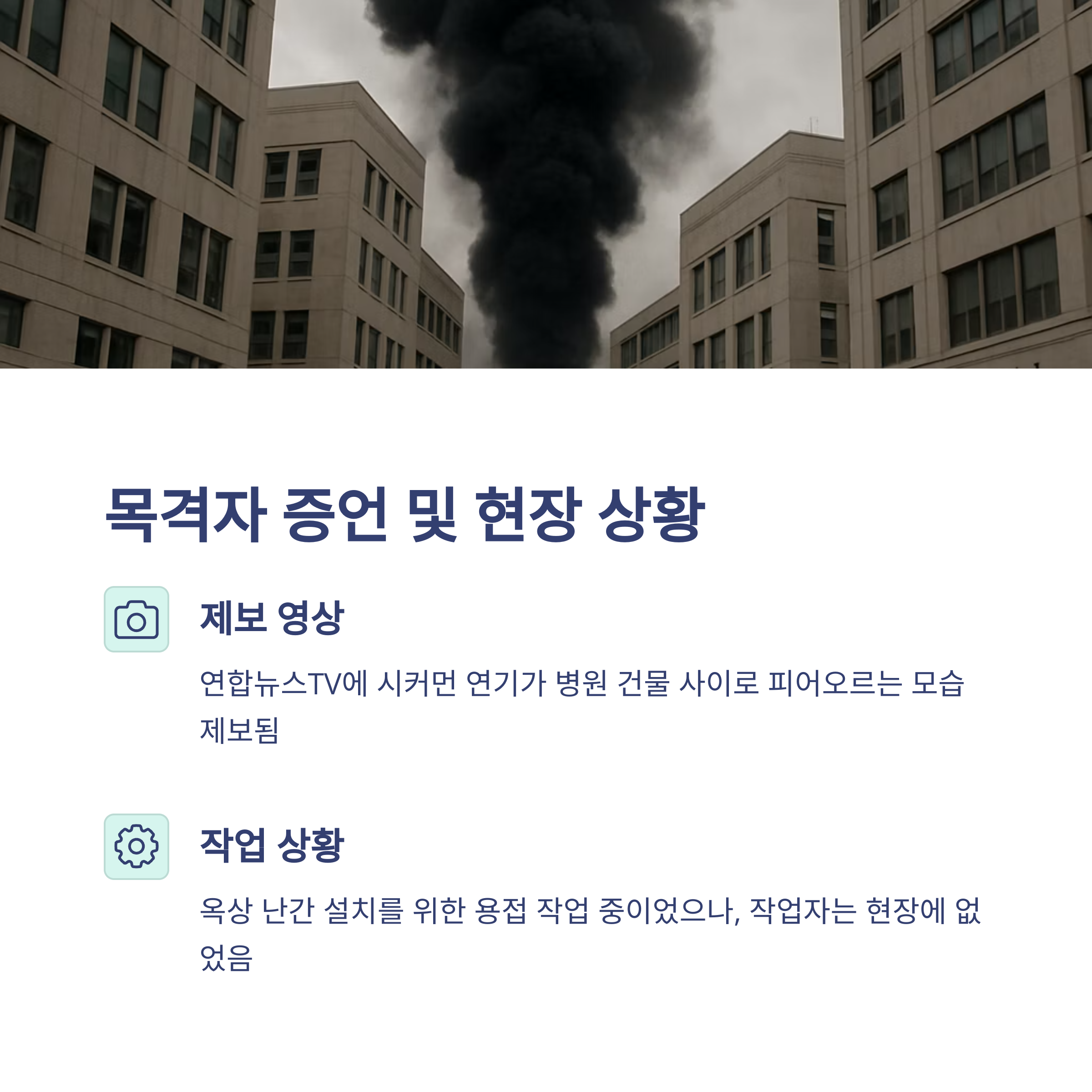 화재는 경희의료원 서관 8층 옥상 냉각탑 부근에서 시작되었습니다. 다행히 건물 내부가 아닌 외부 옥상이었기에 화염 확산 범위가 제한적이었습니다. 현장을 목격한 시민들에 따르면, 시커먼 연기가 병원 건물 사이로 치솟았다고 전해졌으며, 연합뉴스TV에도 관련 영상이 제보되어 화재 상황이 빠르게 알려졌습니다. 해당 시각 옥상에서는 난간 설치를 위한 용접 작업이 이루어지고 있었으나, 작업자는 자리를 비운 상태였습니다.