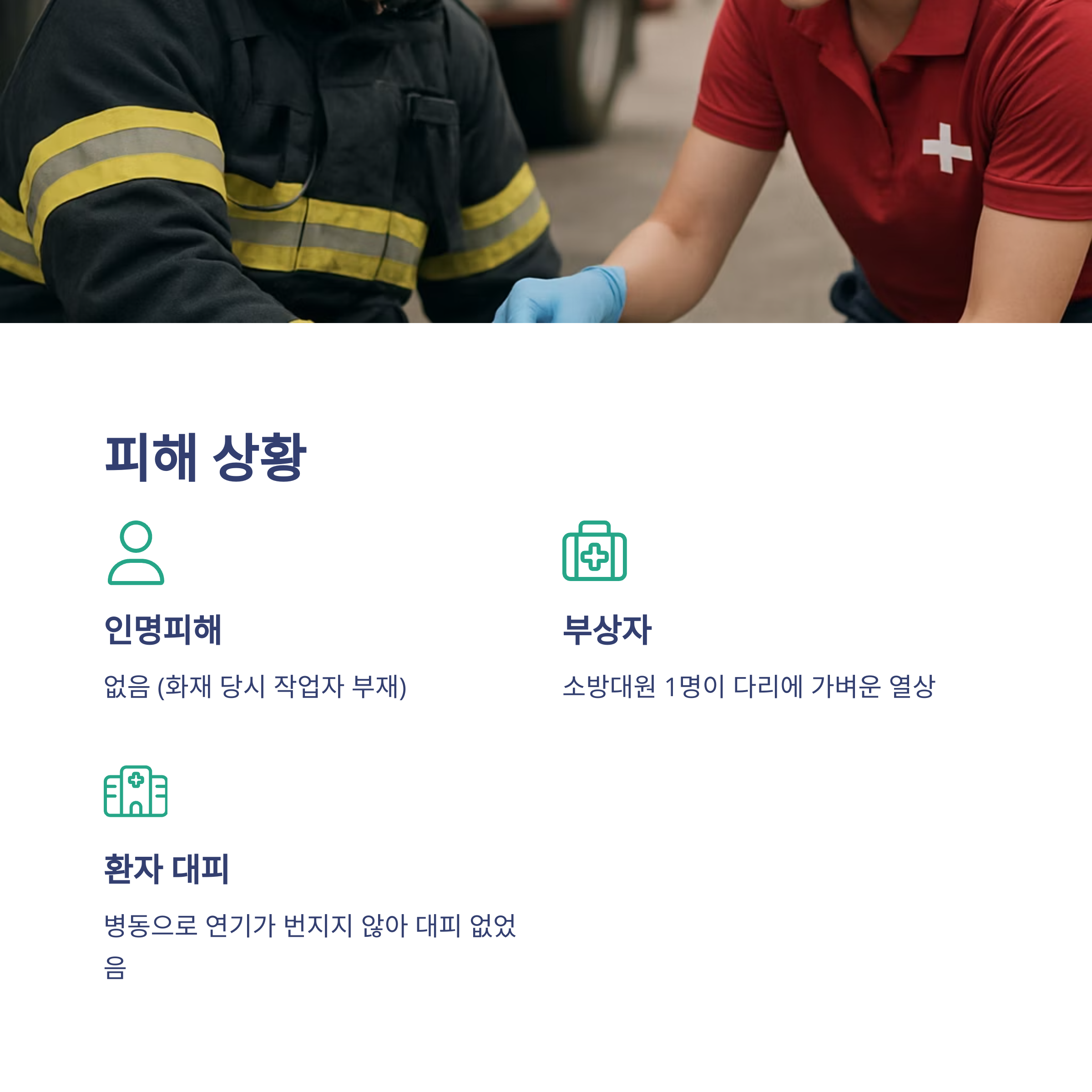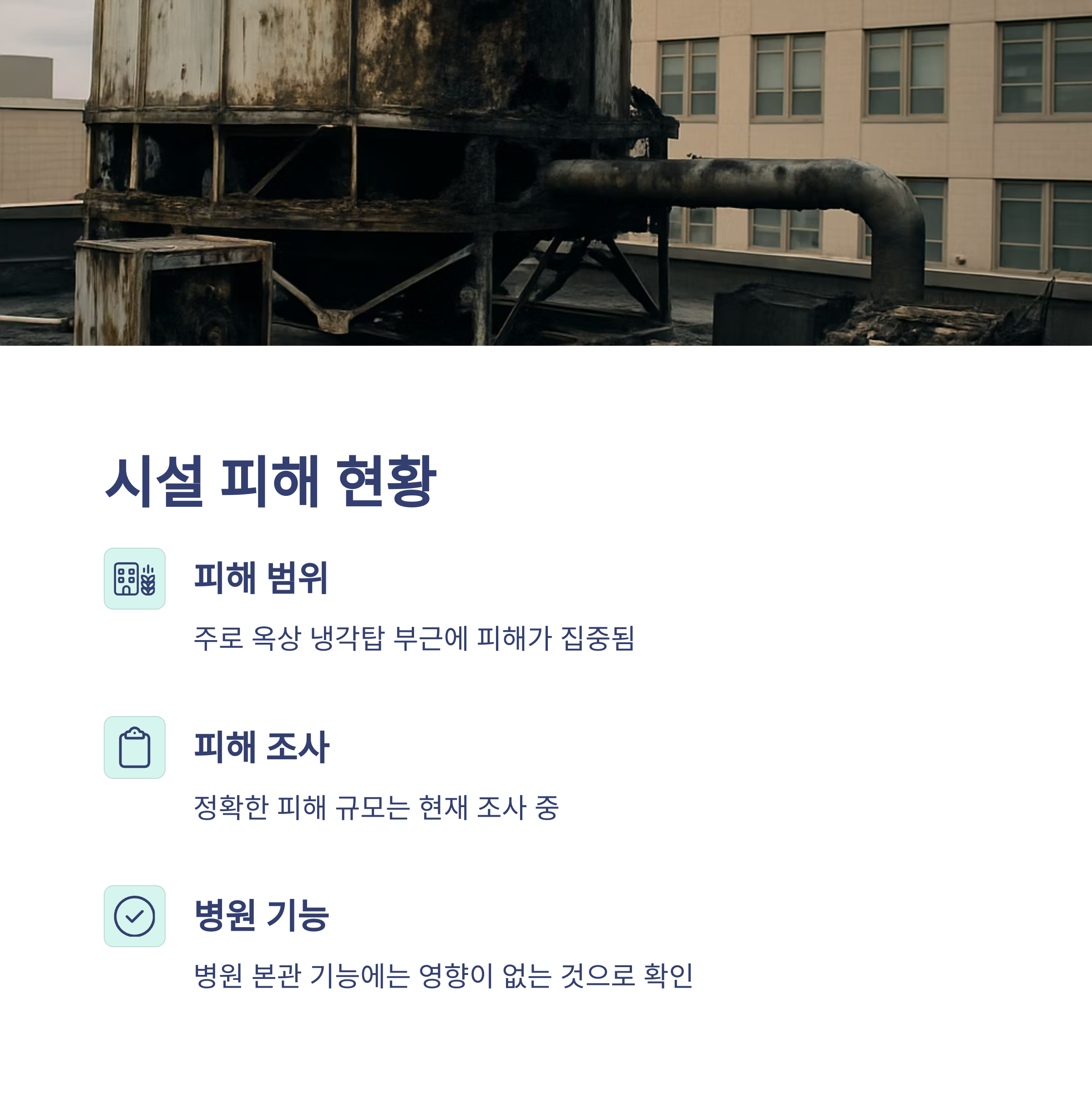 다행히 인명피해는 전혀 없었습니다. 화재 발생 당시 작업자가 현장에 없었고, 병원 내 환자 및 직원의 대피도 필요하지 않았습니다. 다만, 소방대원 1명이 화재 진압 중 다리에 가벼운 열상을 입었지만 현장에서 즉시 치료를 받았습니다. 시설 피해는 주로 옥상 냉각탑 부근에 집중되어 있으며, 병원 본관과 병동은 정상 운영 중입니다.