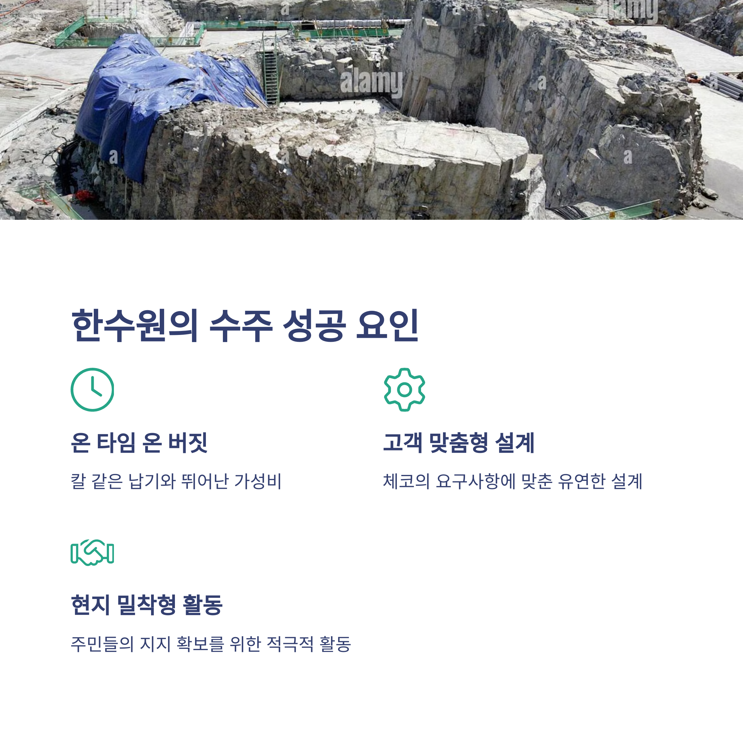 정시 납기, 예산 준수, 현지 맞춤형 설계, 주민 지지 확보 등 여러 면에서 경쟁사보다 우수한 평가를 받았습니다.