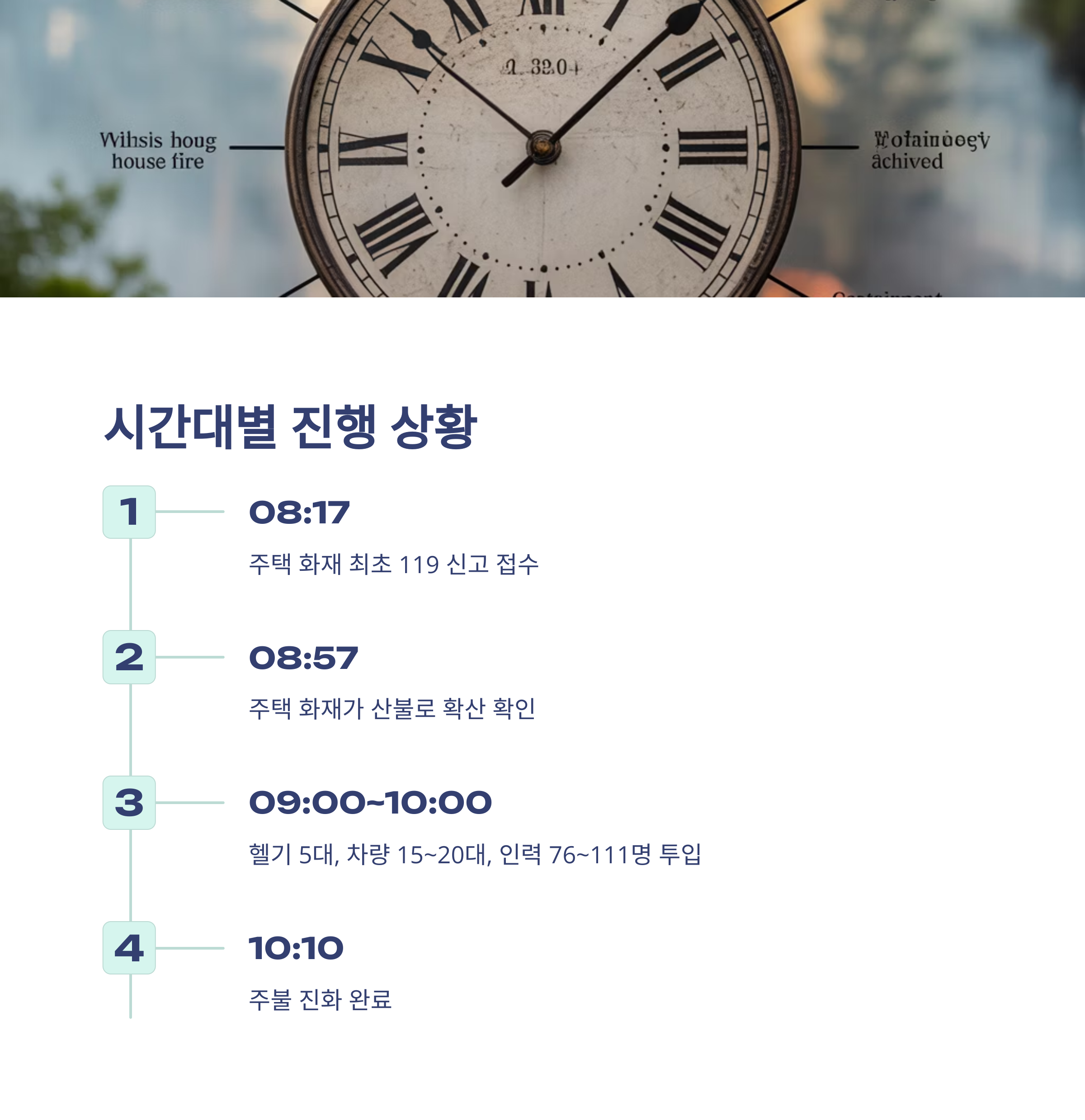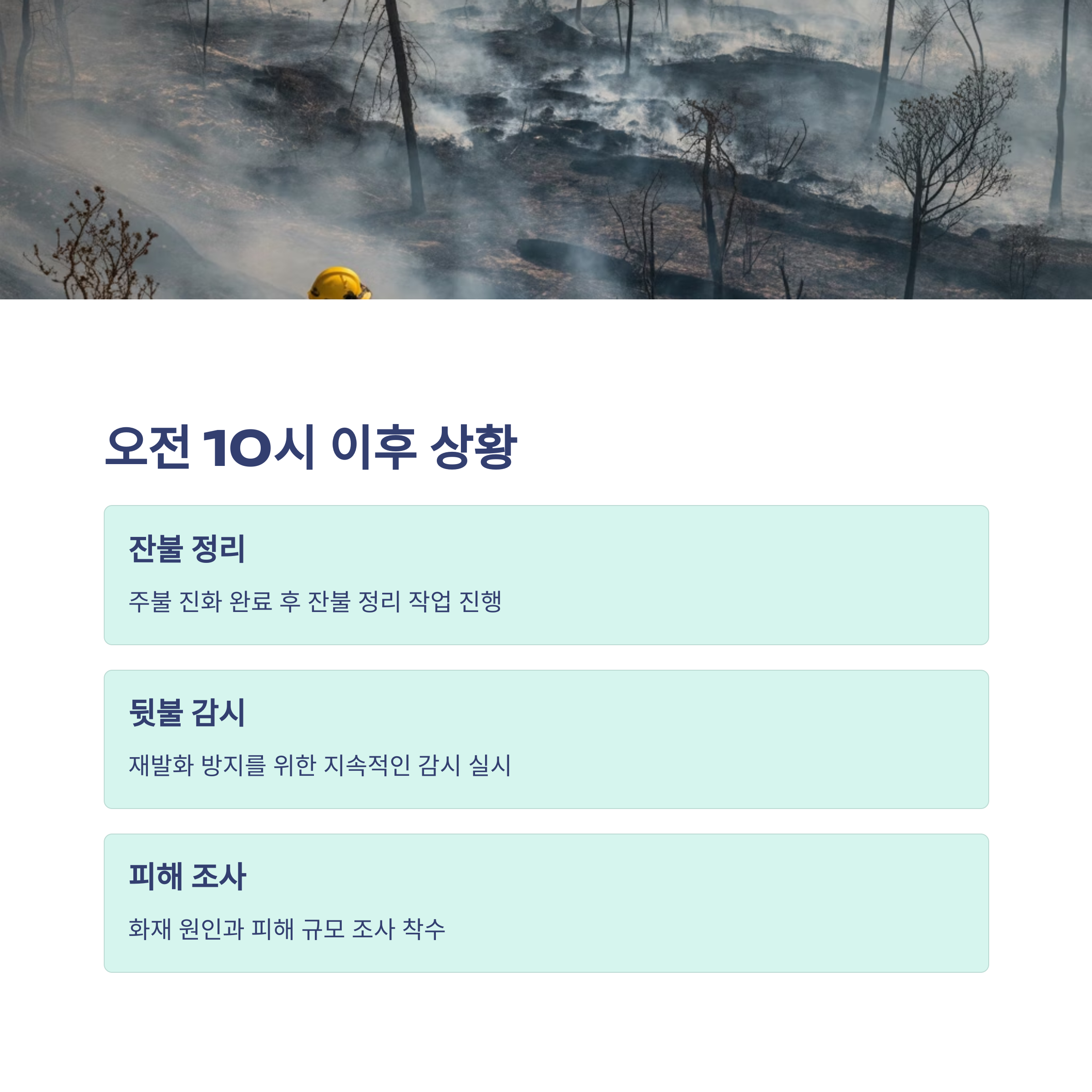 | 10:10 이후 | 잔불 정리 및 뒷불 감시 진행 중 |