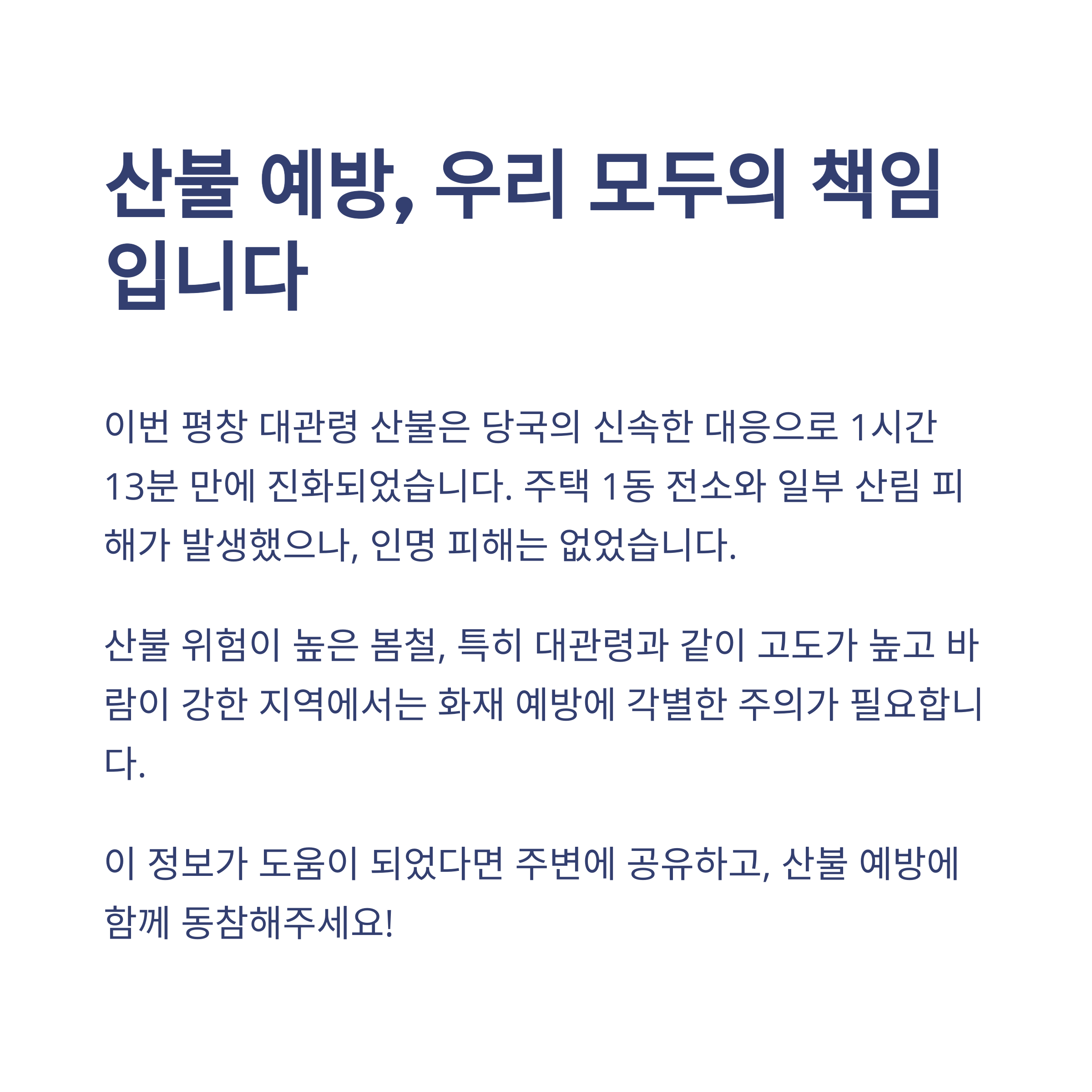 다행히 큰 인명 피해 없이 진화가 완료되었지만, 자연을 대하는 우리의 태도와 대비는 여전히 중요합니다.
