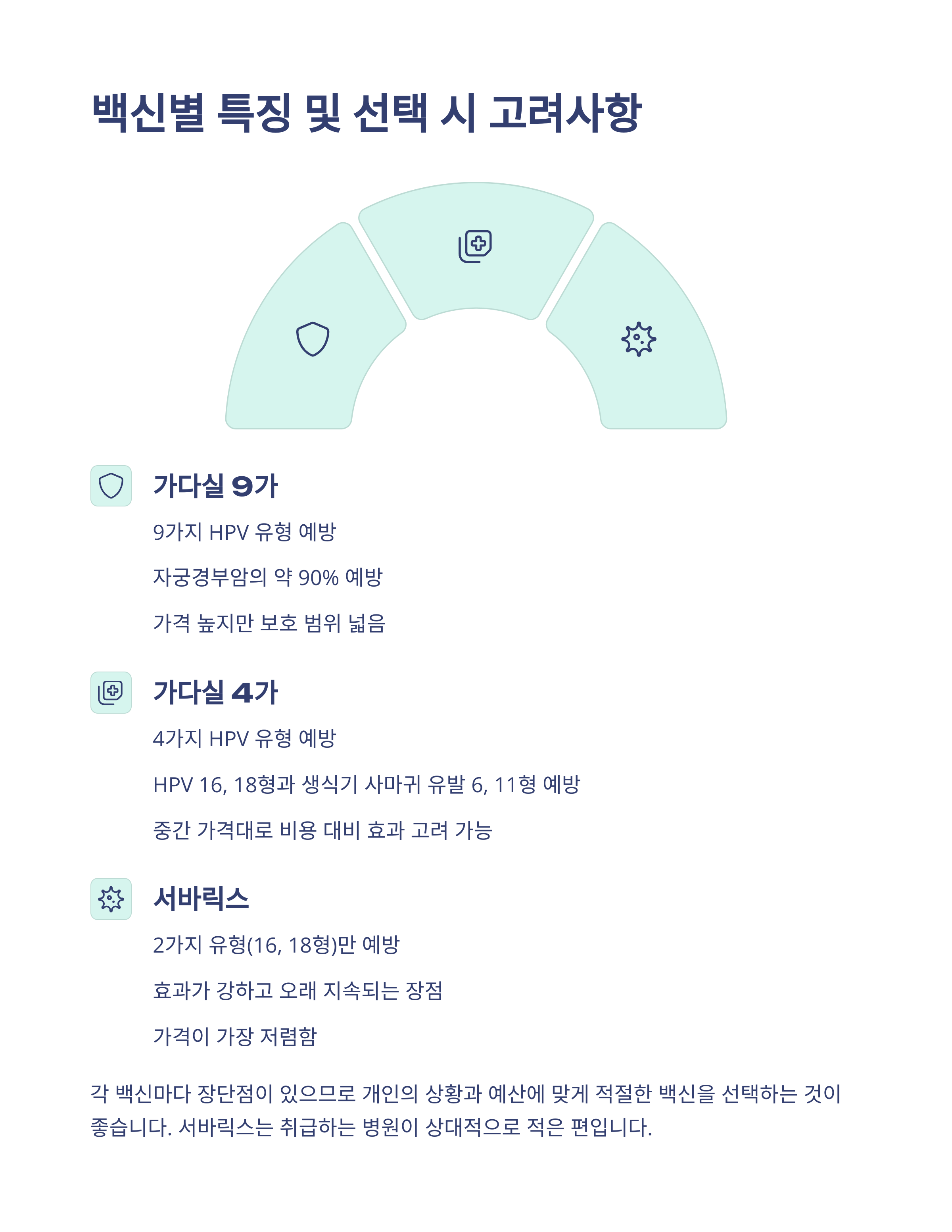 자궁경부암 예방 백신은 크게 세 가지가 있어요. 예방 가능한 HPV 유형 수, 효과 범위, 가격이 각각 다르기 때문에 잘 비교해서 선택하는 것이 중요합니다.