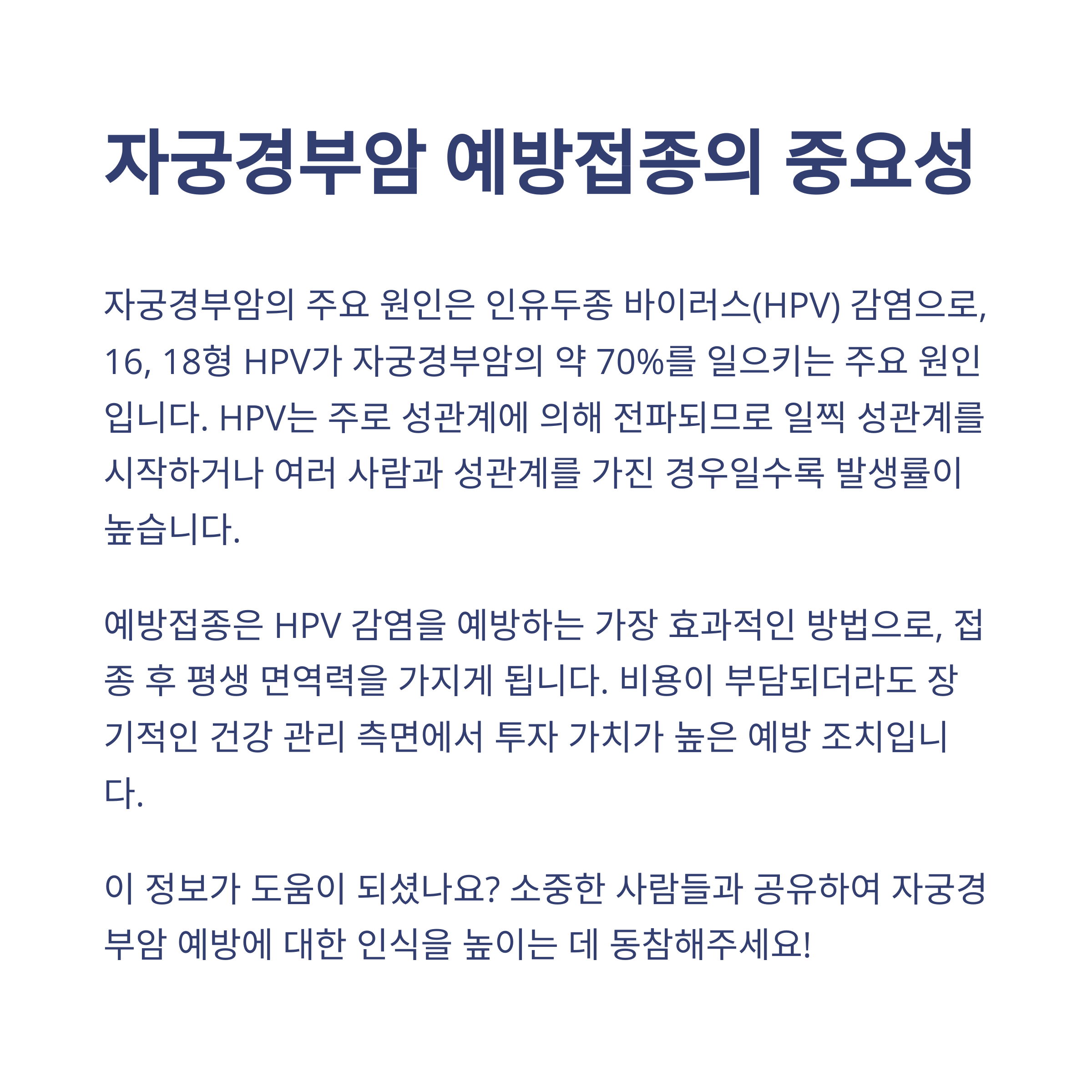 자궁경부암 예방접종은 단순한 백신이 아니라, 미래의 건강을 지키는 강력한 예방 조치입니다. 가격이 다소 부담될 수 있지만, 장기적으로 봤을 때는 그 이상의 가치를 제공하죠.